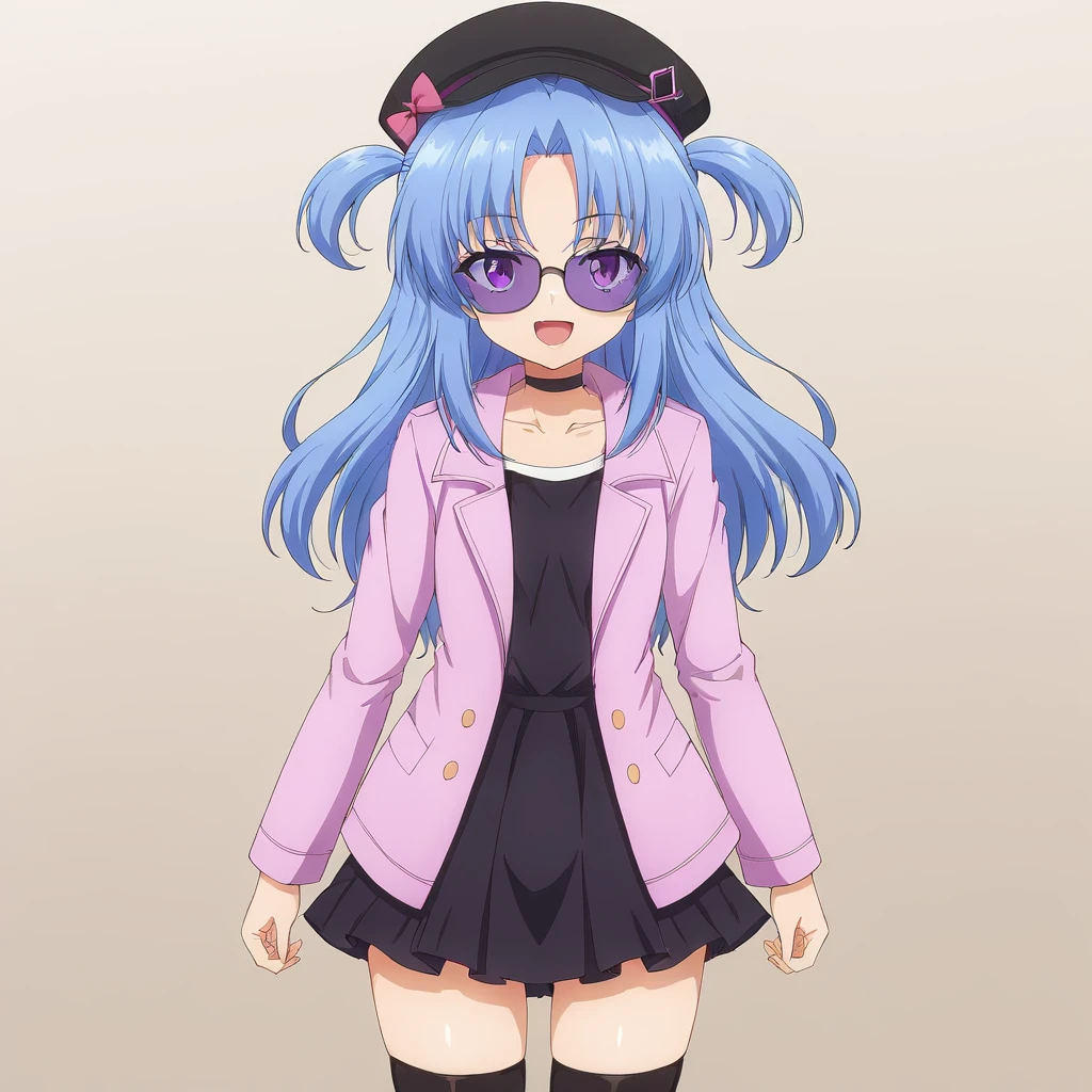 1girl,solo,thighhighs,black thighhighs,smile,long hair,black dress,hat,blue hair,jacket,black headwear,open mouth,dress,collarbone,purple eyes,sunglasses,two side up,bangs,choker,black choker,looking at viewer,long sleeves,open clothes,parted bangs,shiny,zettai ryouiki,short dress,open jacket,skirt,standing,