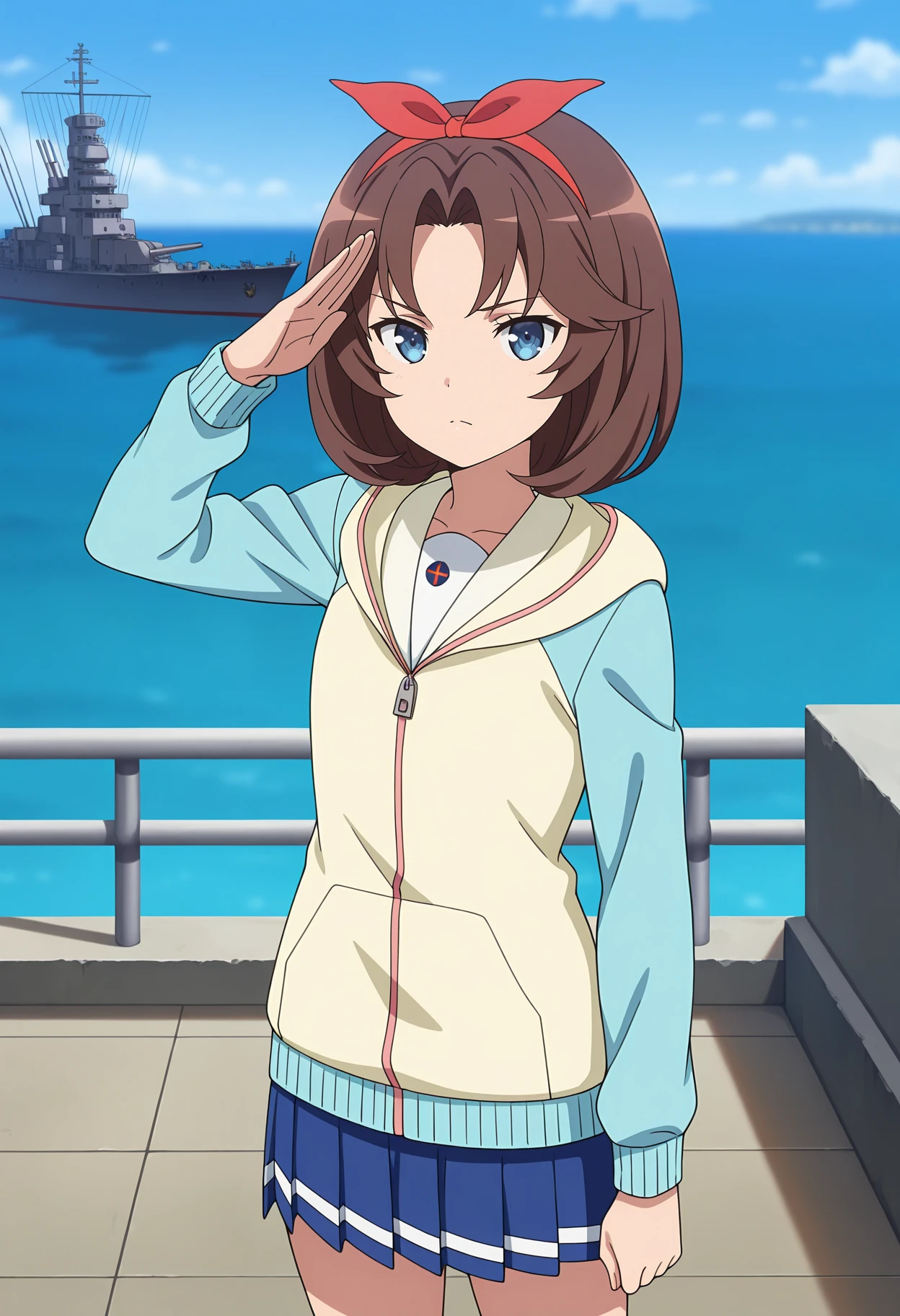 parted bangs, brown hair, blue eyes, red hairband, hair ribbon, red ribbon, hooded jacket, two-tone jacket, blue jacket, yellow jacket, long sleeves, pleated skirt, blue skirt