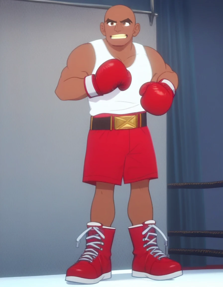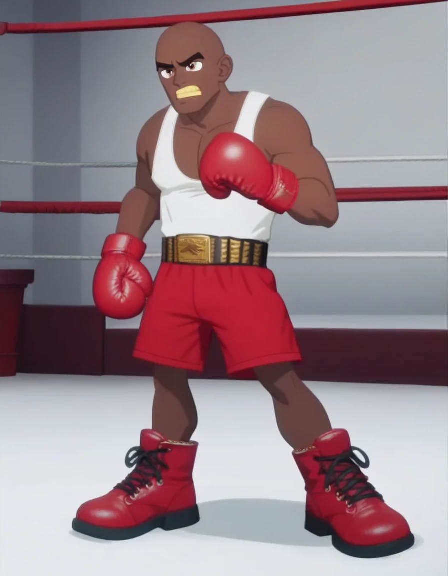DMoneySML, 1boy, brown eyes, shorts, gold teeth, red shorts, boxing gloves, dark skinned male, dark skin, white tank top, red boots, wrestler belt, tall, bald