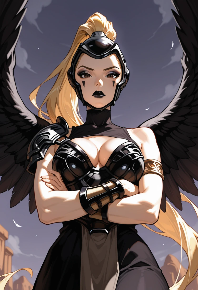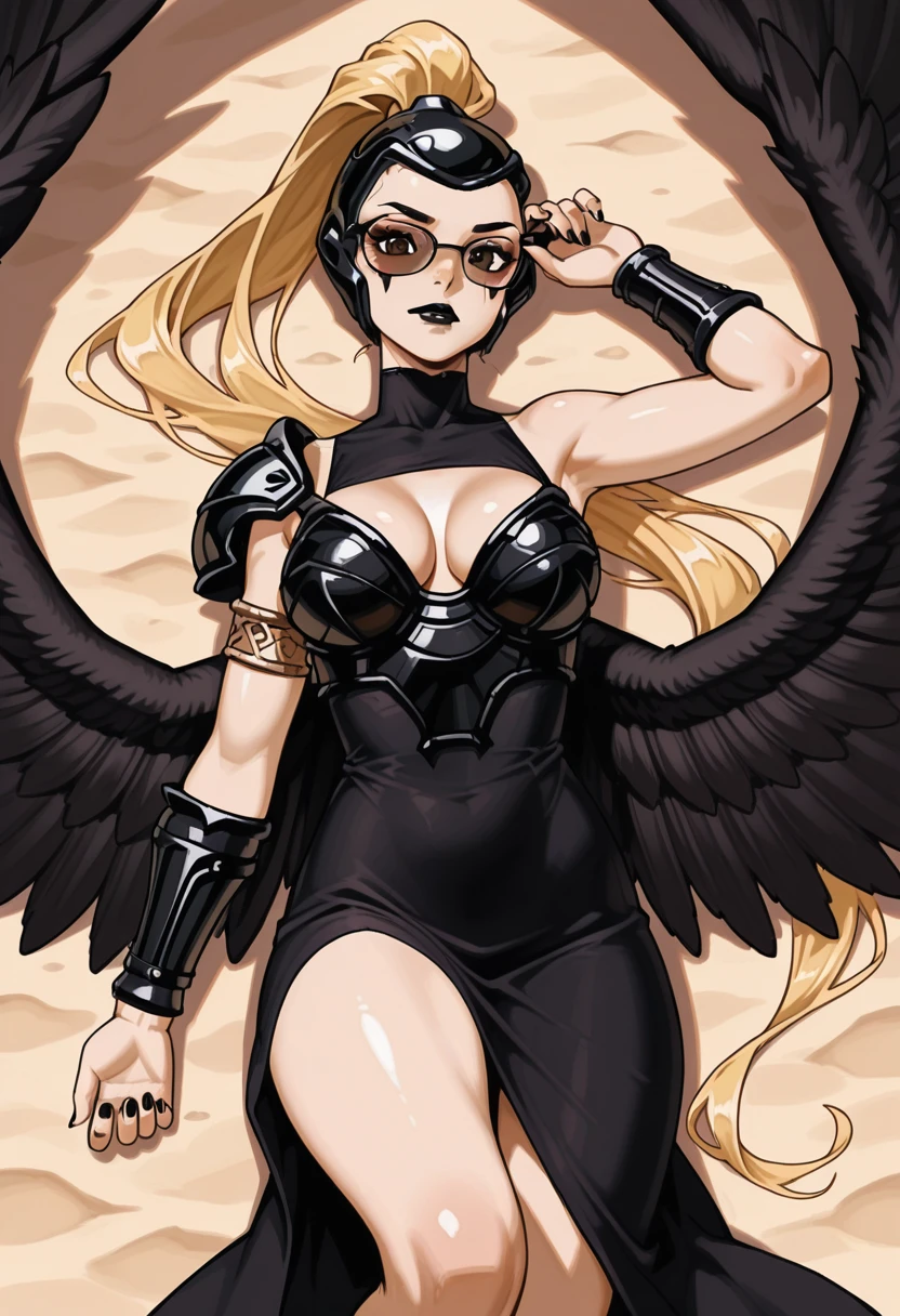 blonde hair, very long hair, brown eyes, ponytail, black lips, facial mark, eyeshadow, wings, feathered wings, black wings,