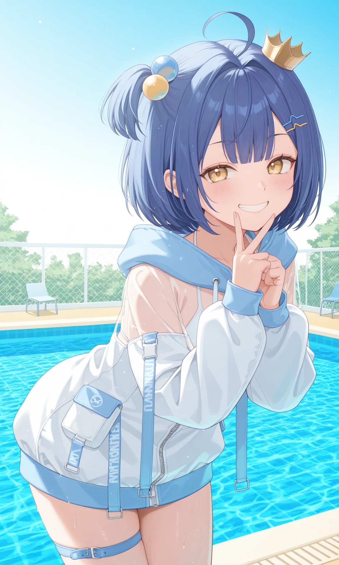 urumi kanon, blue hair, short hair, hairclip, hair bobbles, one side up, mini crown, jacket, see-through, hood, closed jacket, zipper, white bikini, bikini under clothes, thigh strapDefault outfit(open jacket) :