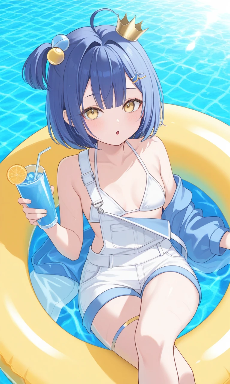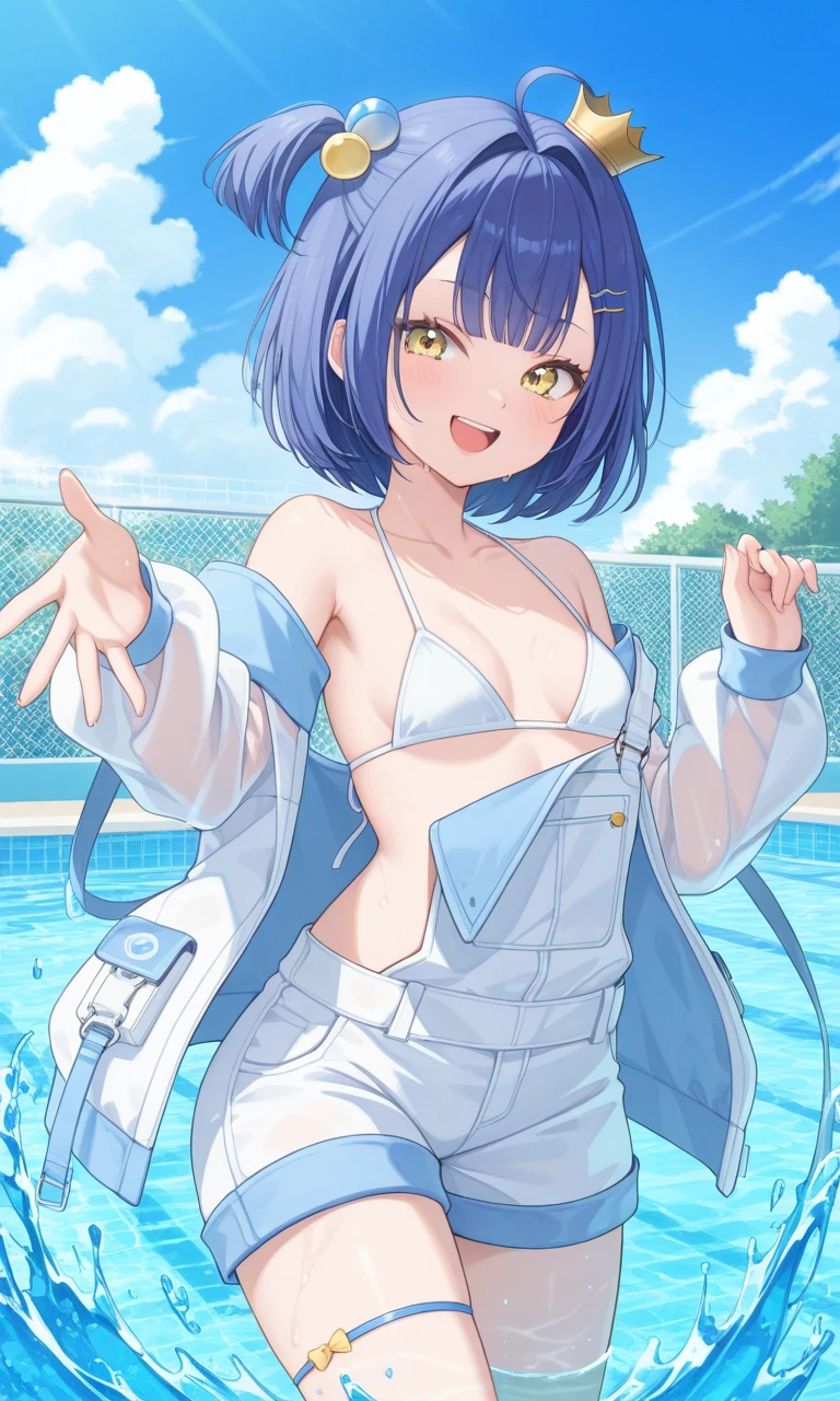 urumi kanon, blue hair, short hair, hairclip, hair bobbles, one side up, mini crown, sleeveless, white bikini, white shorts, overall shorts, overalls partially removed, thigh strap