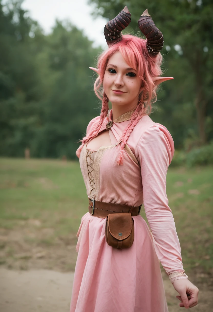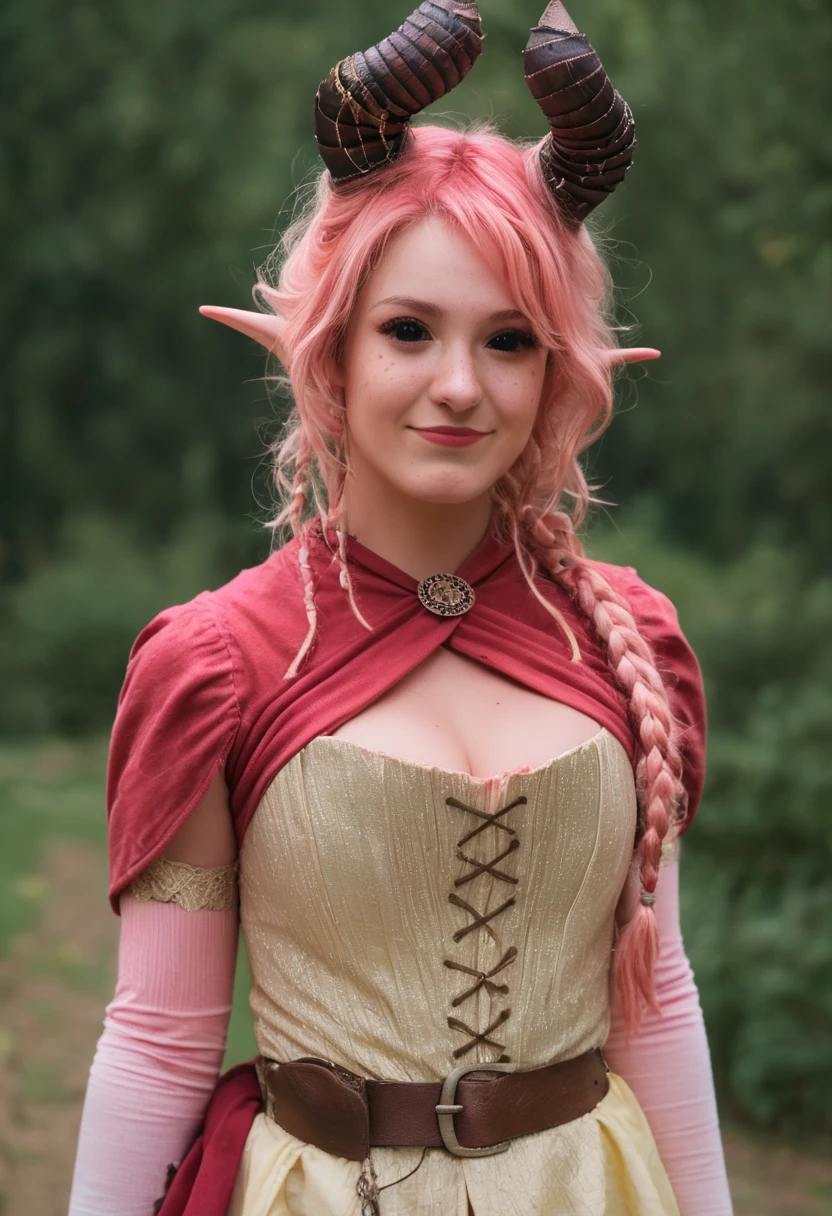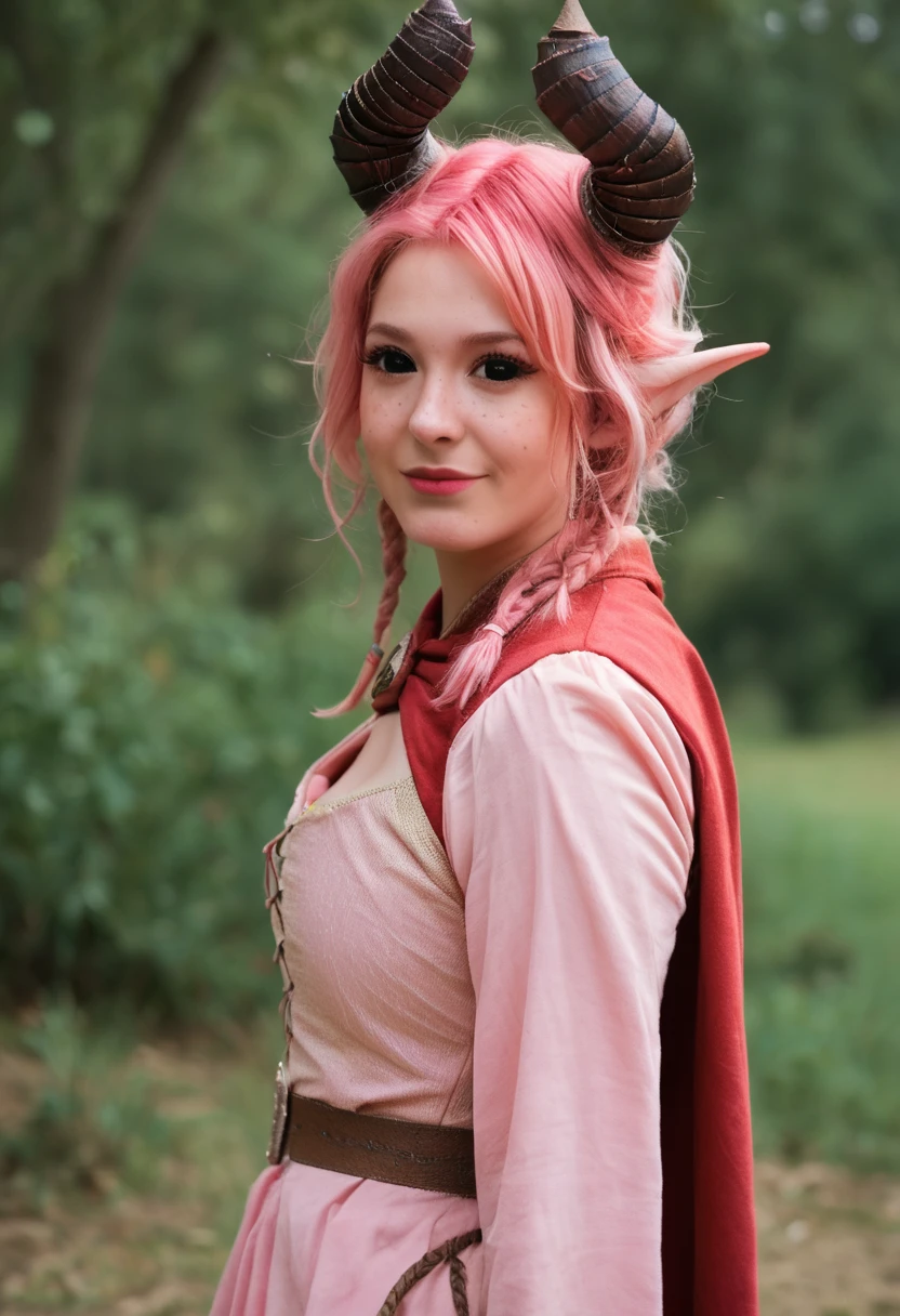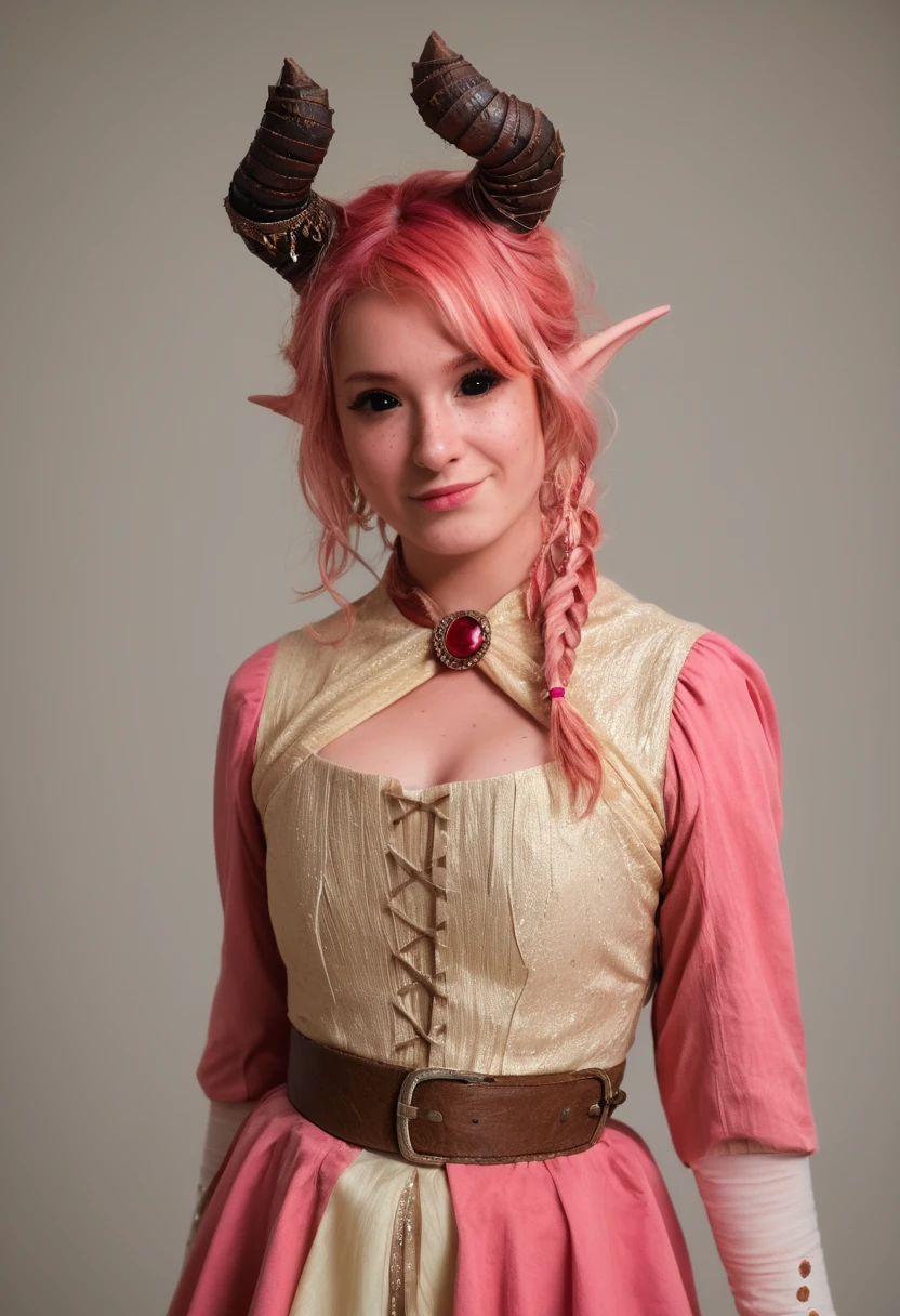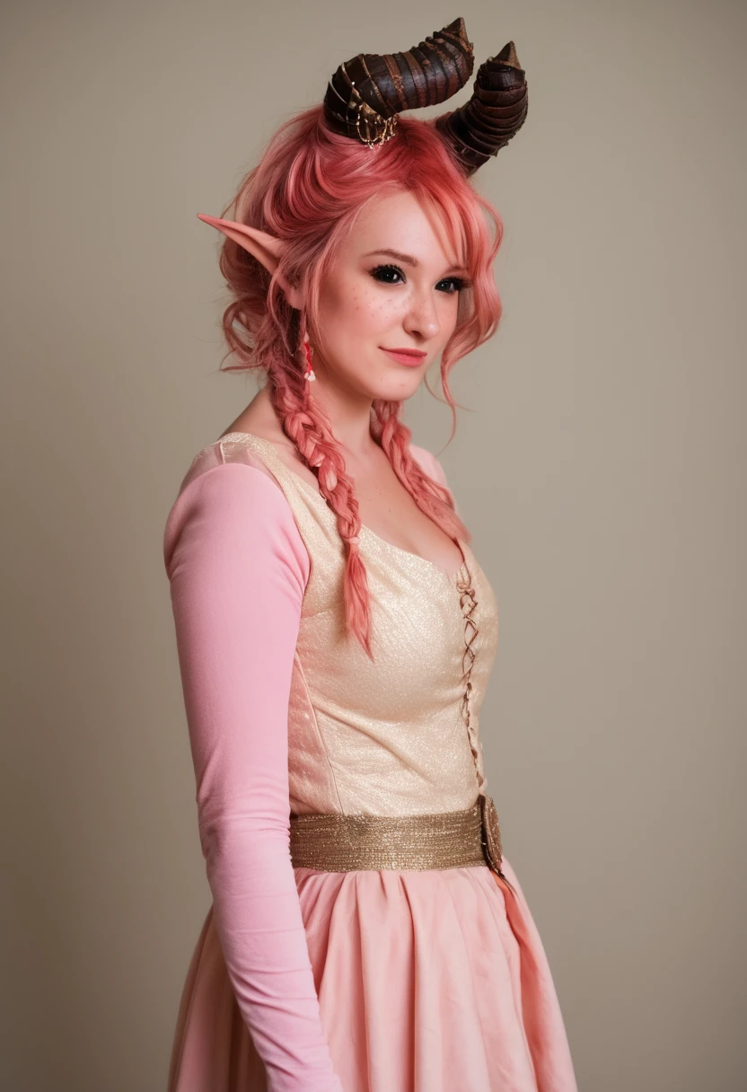 nixie, sclera, black eyes, pink skin, pink colored skin, freckles, pink hair, braid, pointy ears, horns,Outfits Options (These are kind of hit or miss):