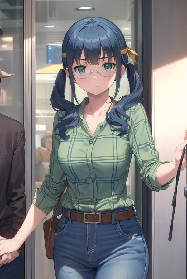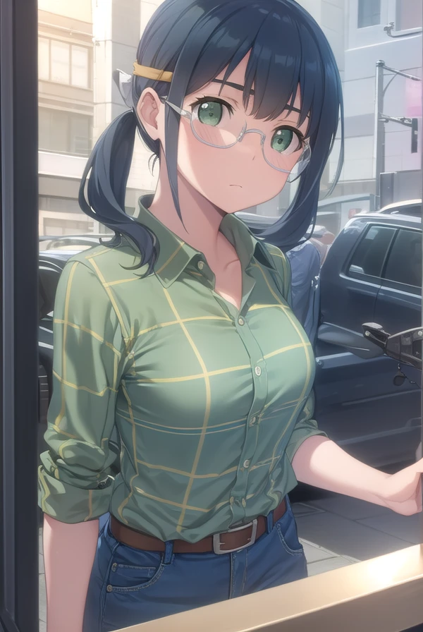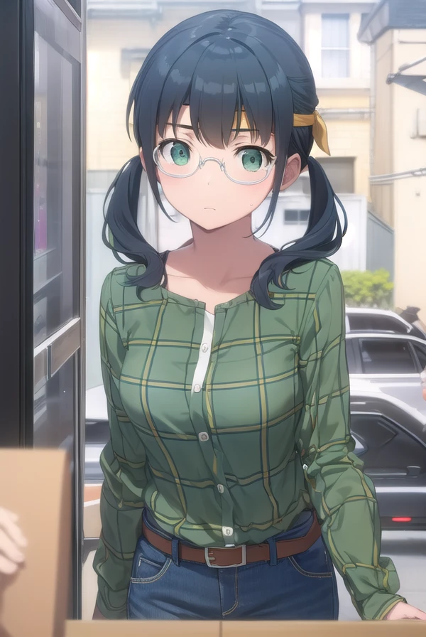 shirt, glasses, belt, pants, headband, denim, jeans, plaid shirt, opaque glasses, (green shirt:1.2),