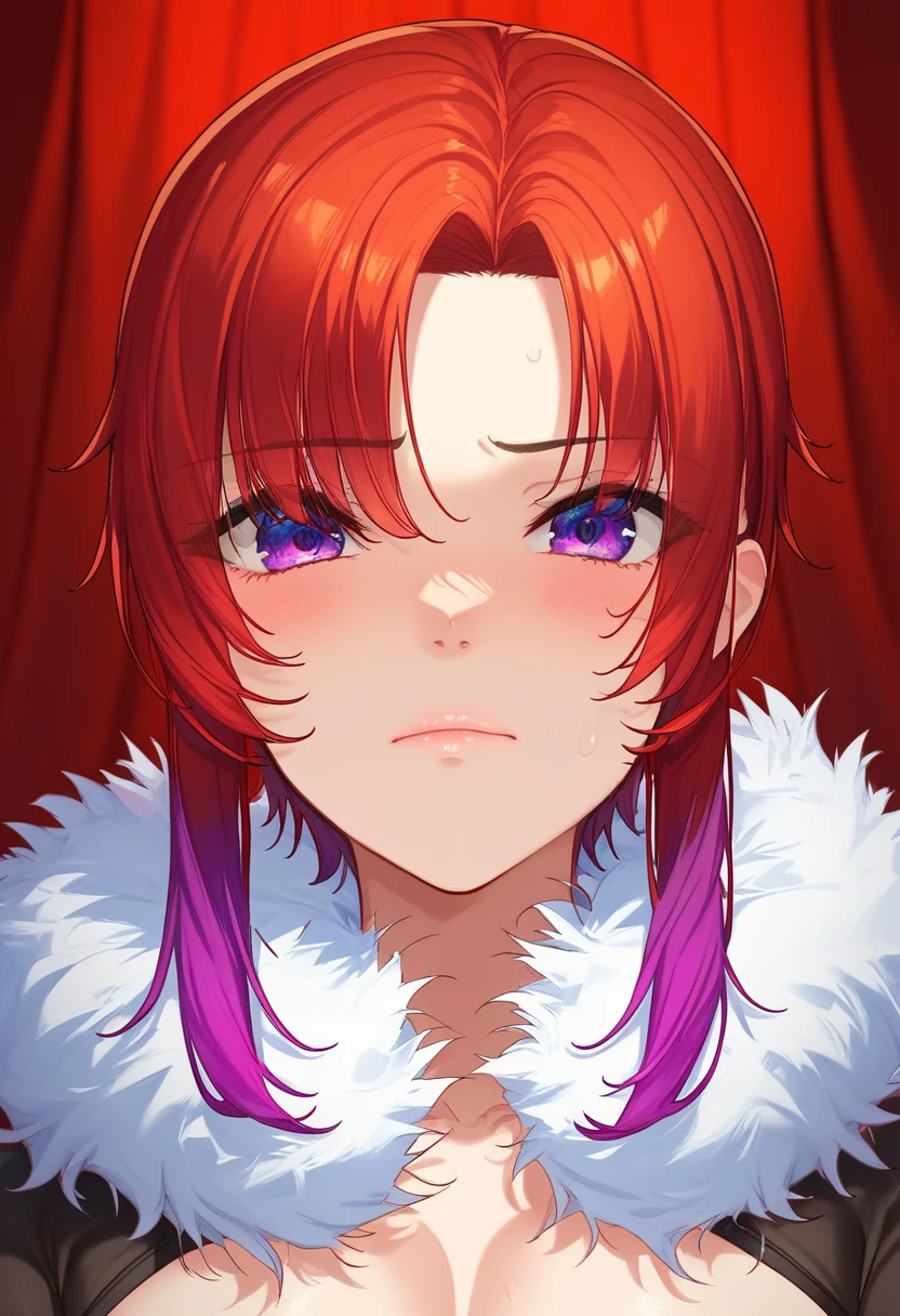 balgo, short red hair, multicolored gradient hair, purple eyes, elysia, long blue hair, red eyes, mature female, makeup,Balgo canonic outfit (better not to use katana's related tags):