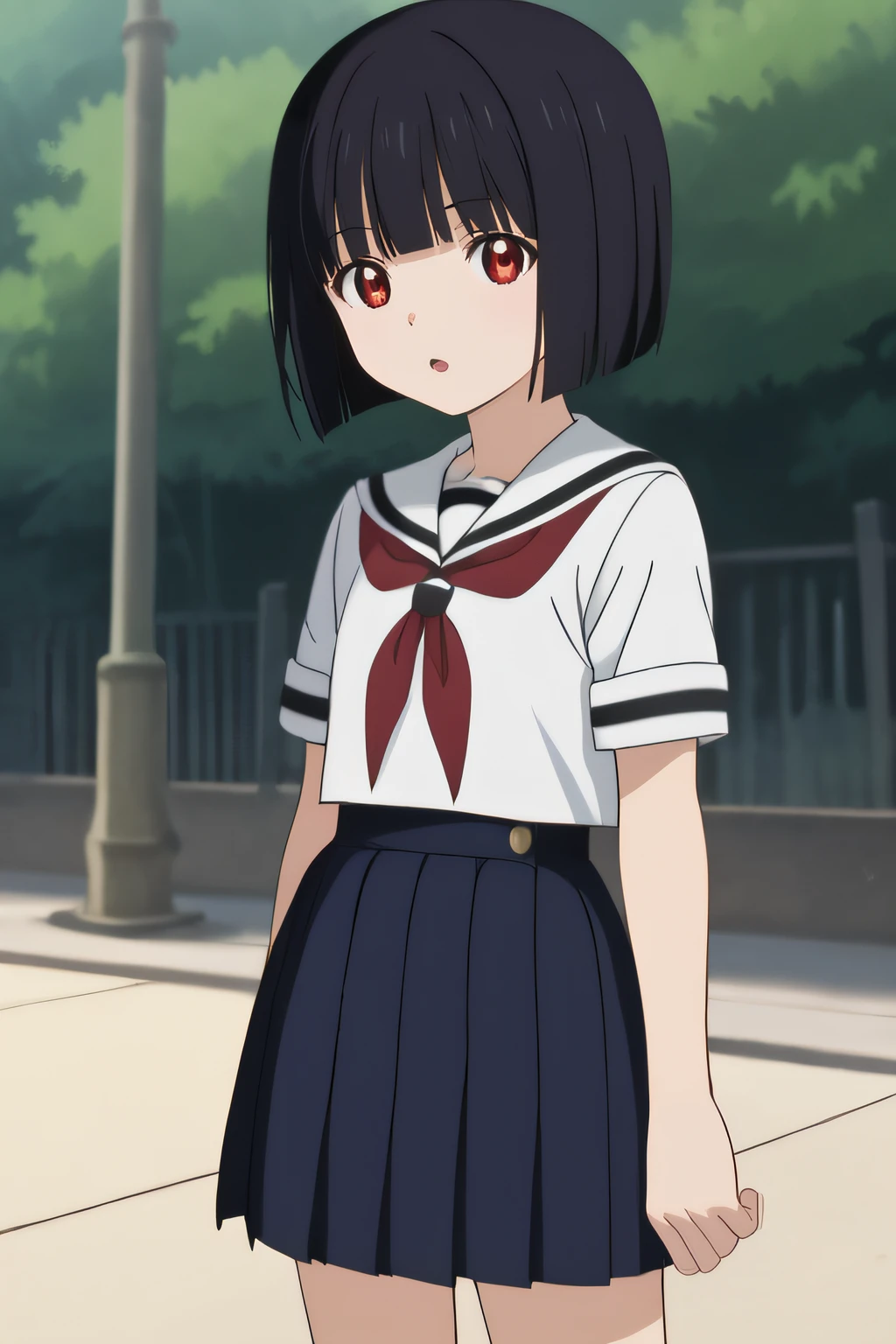 saegusa, black hair, red eyes, bob cut, flat chest, serafuku, red neckerchief, black pleated skirt