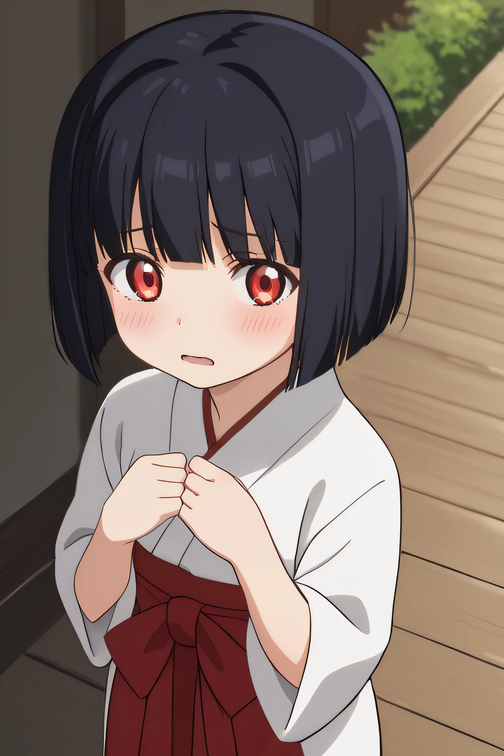 saegusa, black hair, red eyes, bob cut, flat chest, miko, red hakama, japanese clothes, tabi