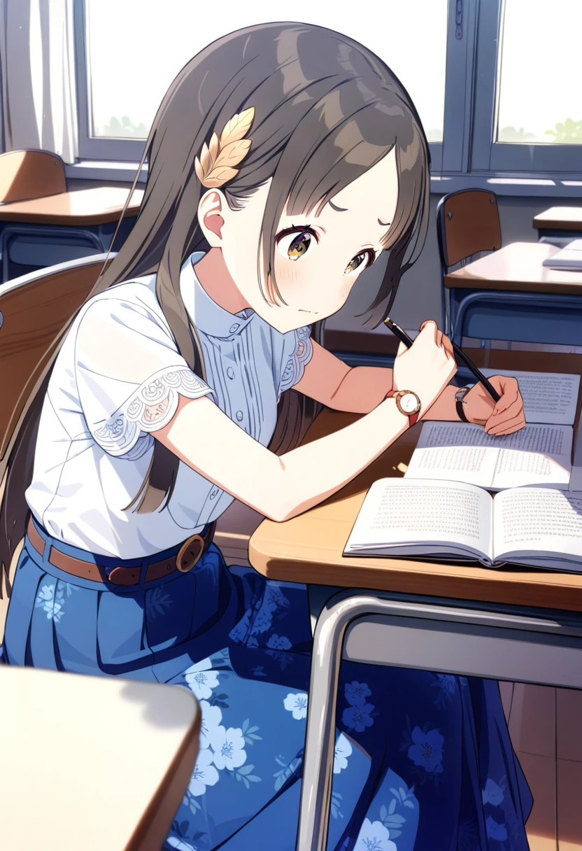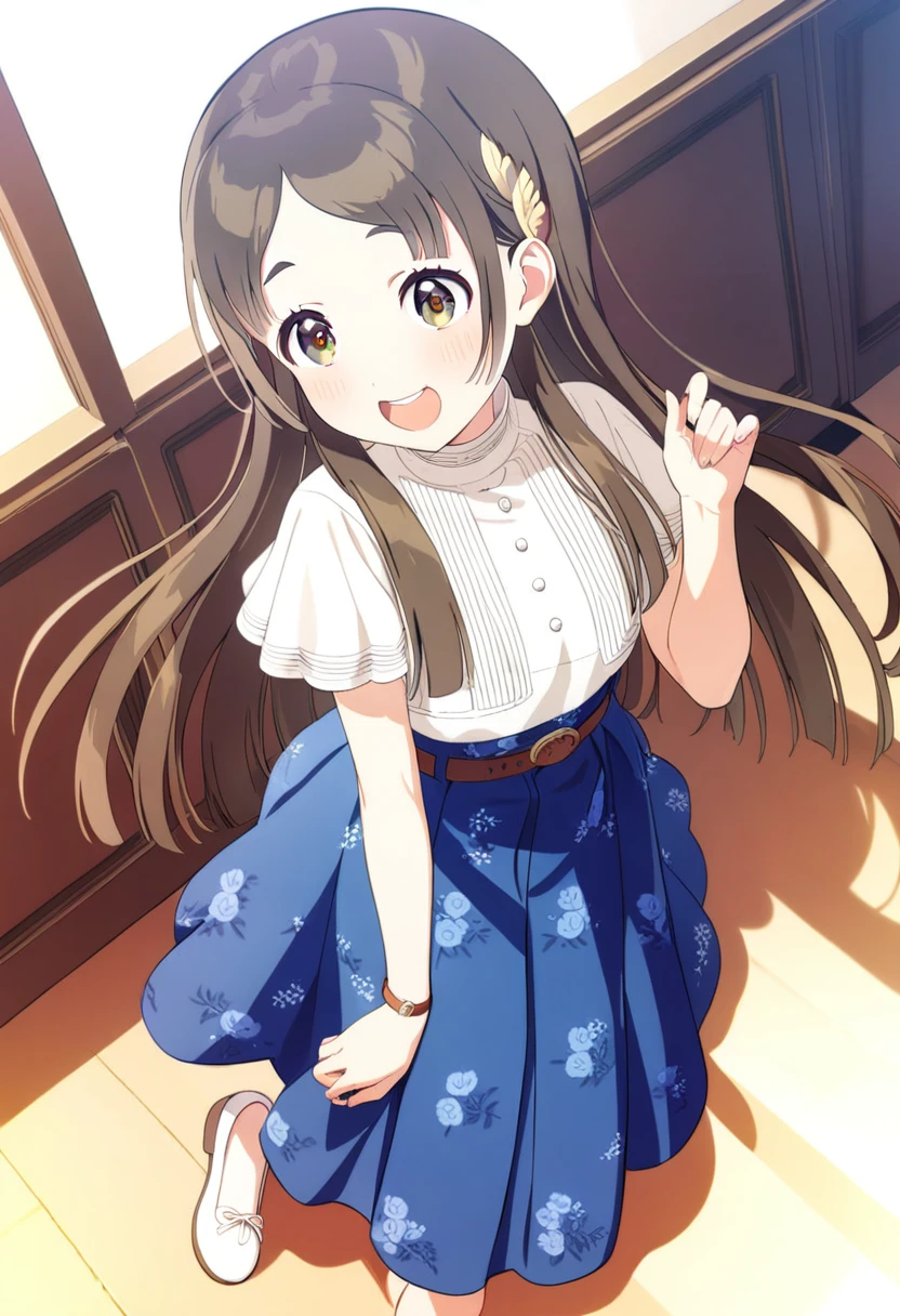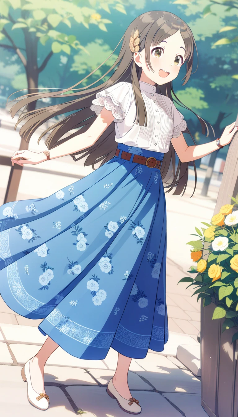 white shirt, short sleeves, blue long skirt, floral print, white footwear, hair ornament, belt, wristwatchDescription