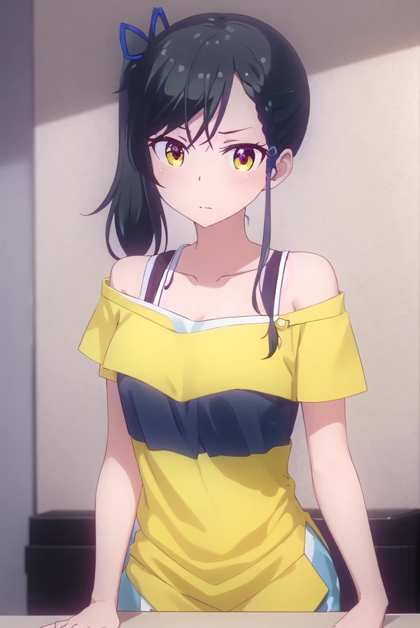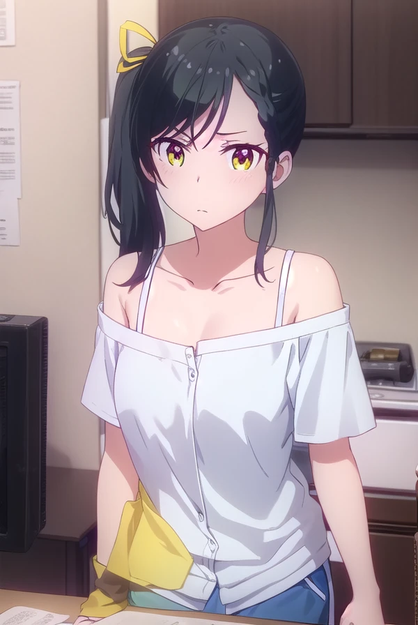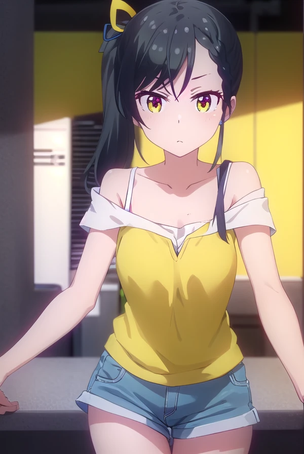 tsubame narumi, black hair, ribbon, hair ribbon, (yellow eyes:1.3), side ponytail, braid, single braid,