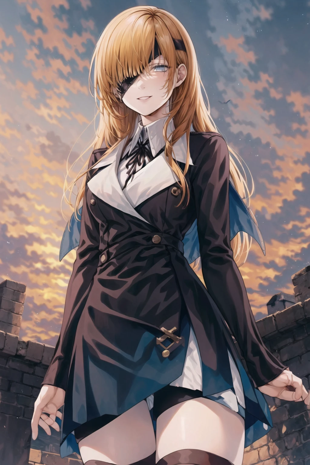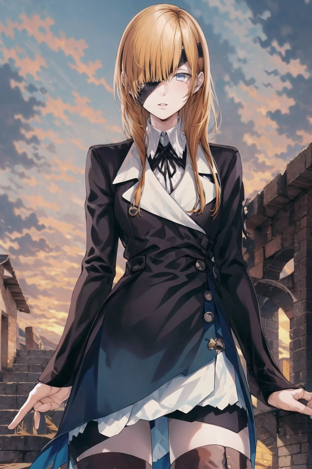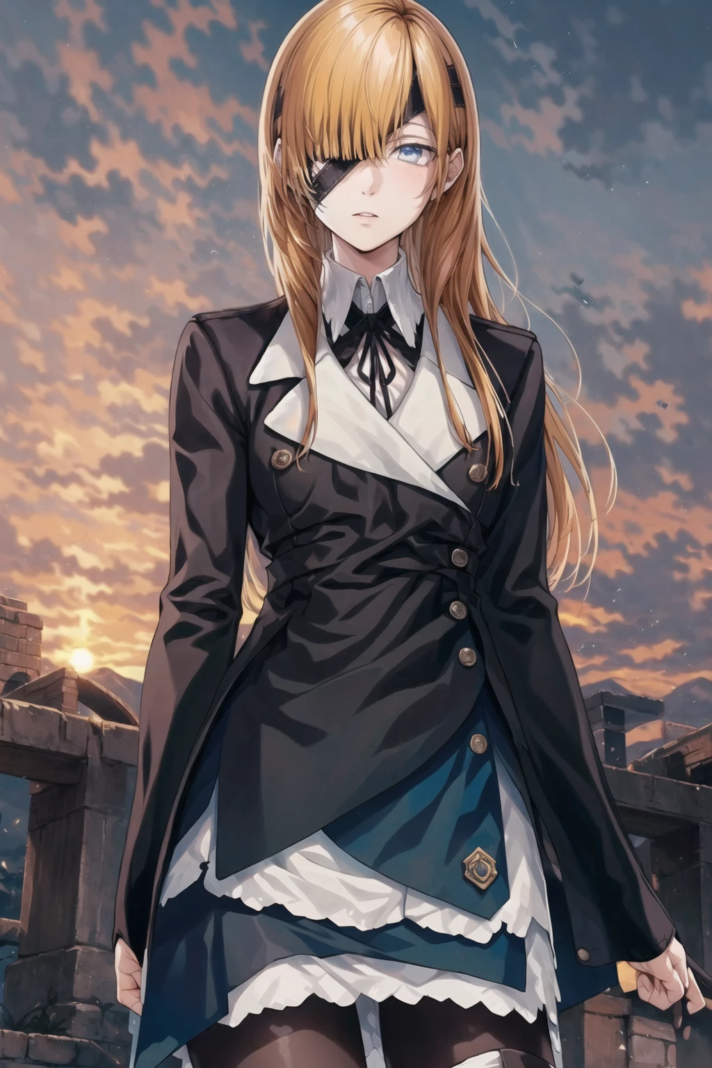 Recommended Tags: Ophelia, long hair, blue eyes, skirt, brown hair, shirt, long sleeves, ribbon, jacket, white shirt, pantyhose, boots, collared shirt, blue skirt, black jacket, black pantyhose, black ribbon, neck ribbon, brown footwear, eyepatch, knee boots