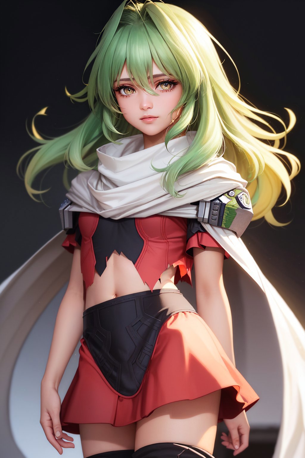 Default Outfit: torn clothes, armor, pauldrons, skirt, thighhighs, scarf, midriff