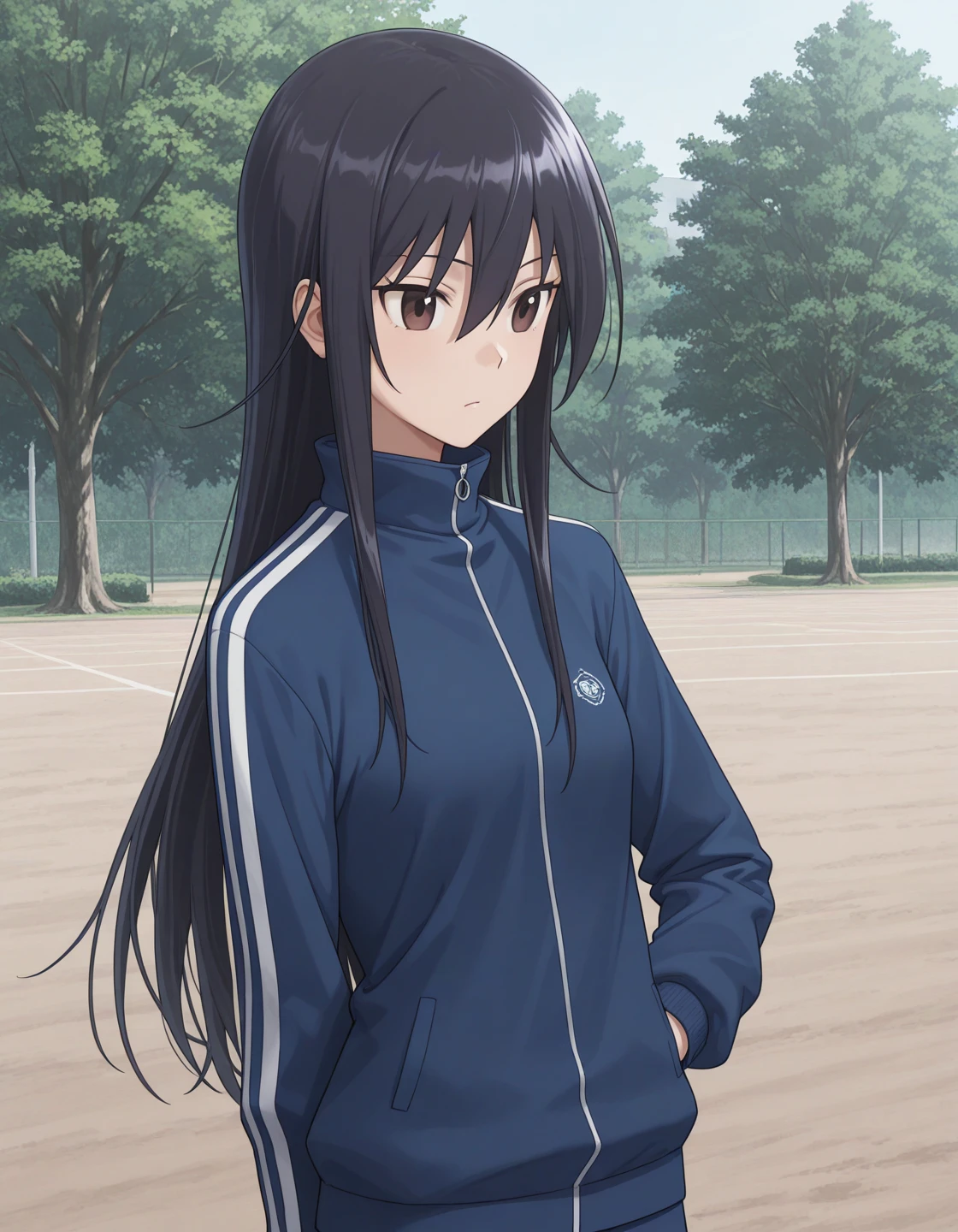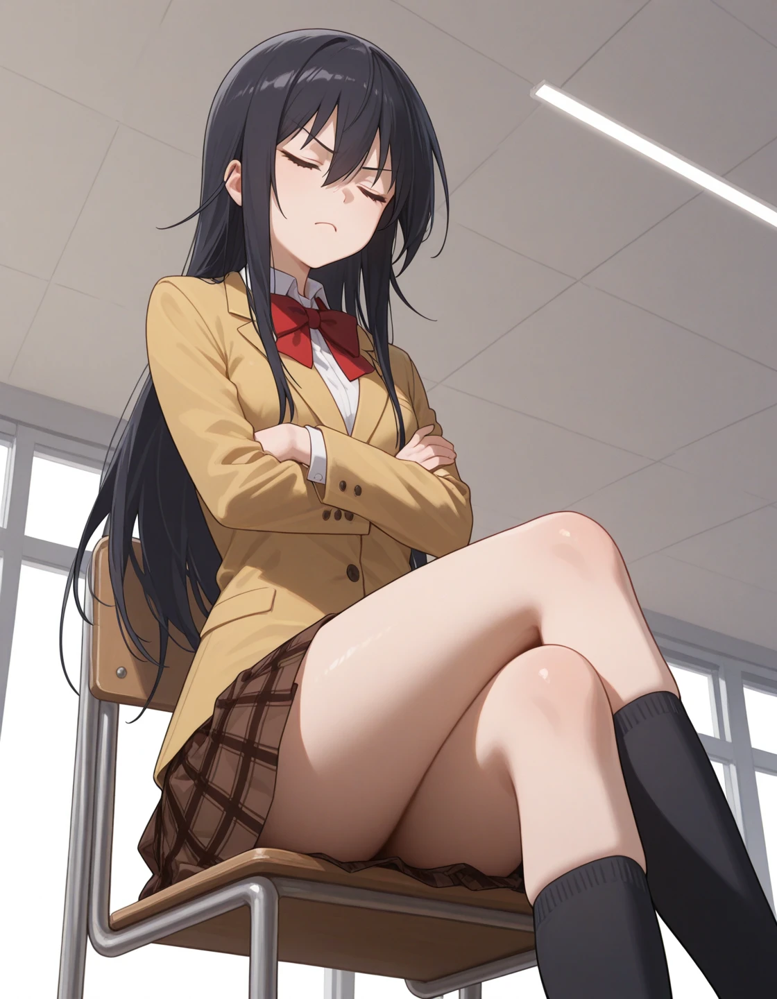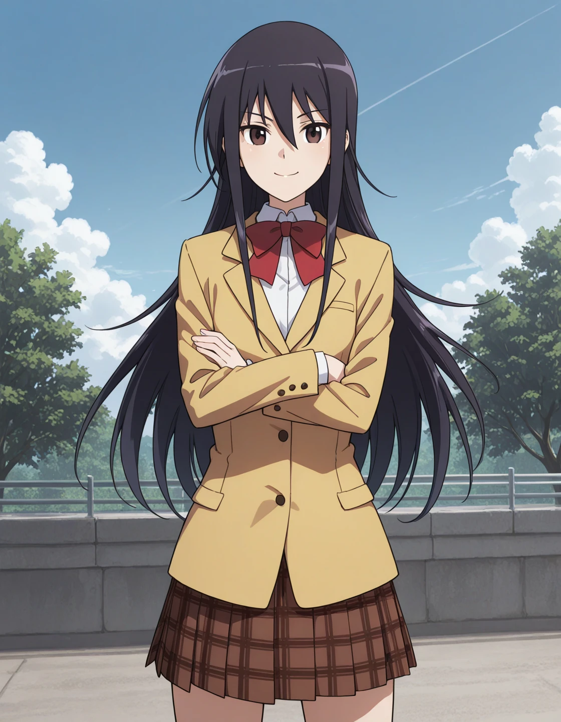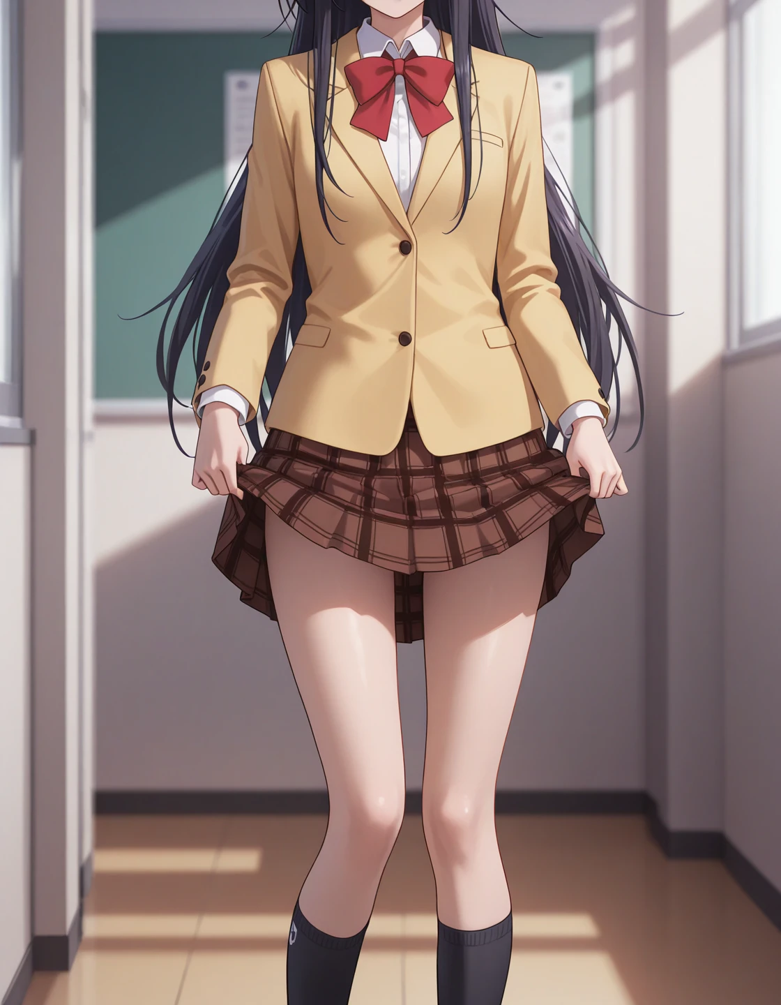 amakusa shino, black hair, long hair, hair between eyes, Ousai_Uniform, school uniform, yellow blazer, white shirt, collared shirt, red bow, plaid skirt, brown skirt, black socks