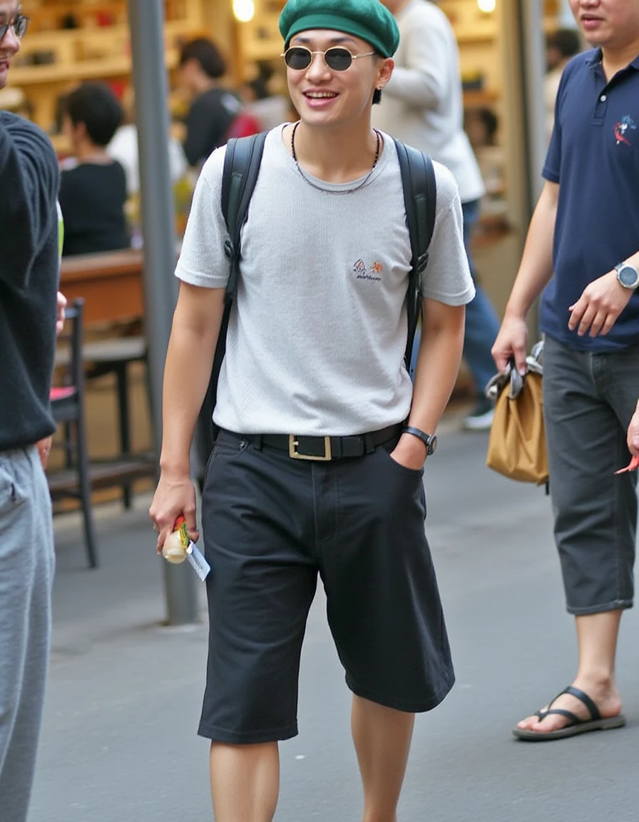 Sample prompt : 9o_korst2_2, 1man walking down street, smile, open_mouth, male focus, (solo:1.2), chic, wear short pants, red tshirts, bare foot, wear green beret, side view, answering phone