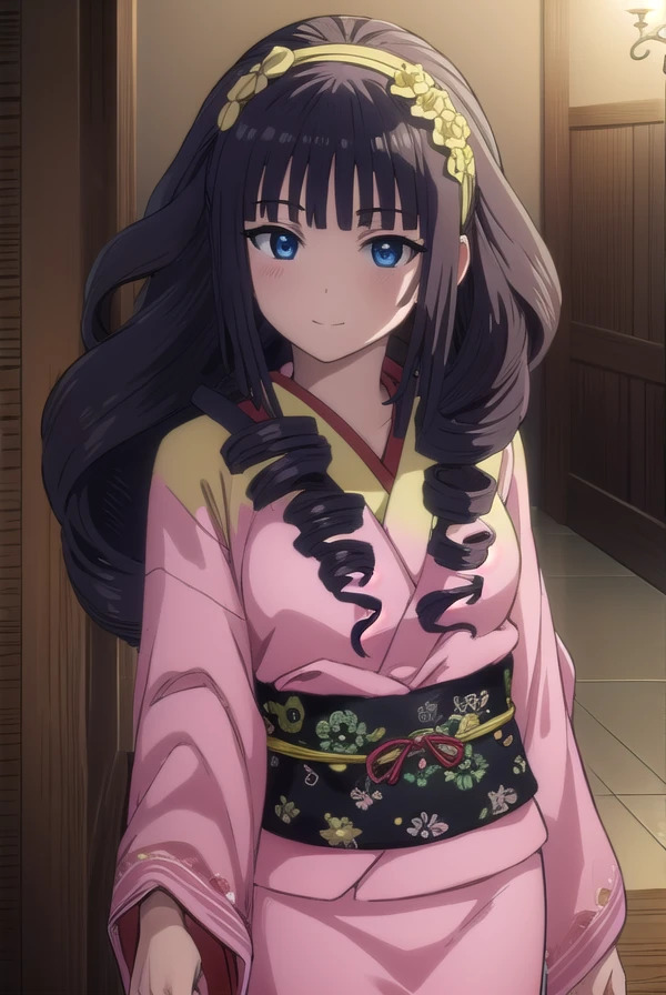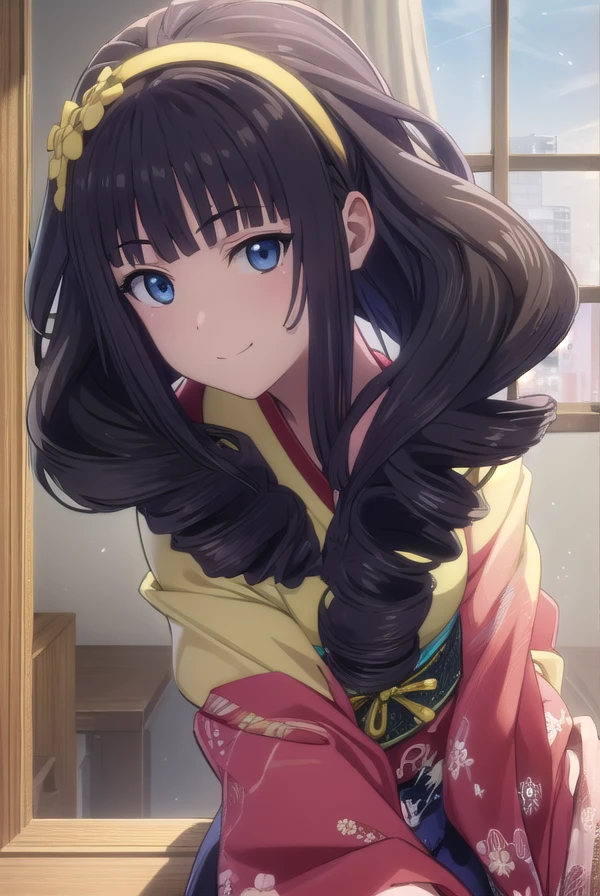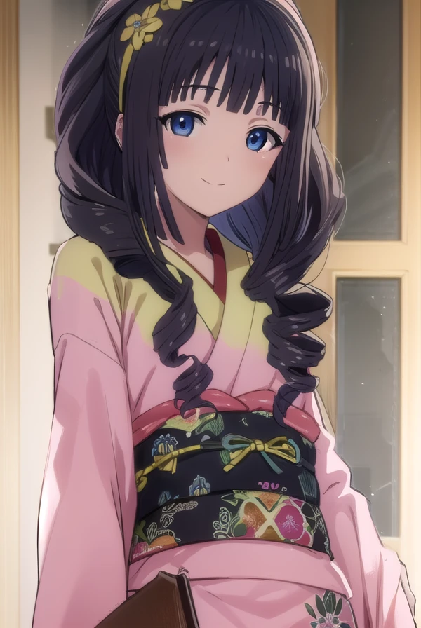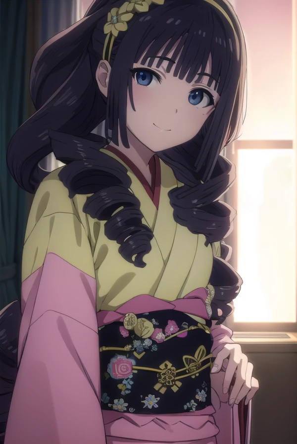 miori shiba, long hair, black hair, hair ornament, (black eyes:1.3), hairband, drill hair,