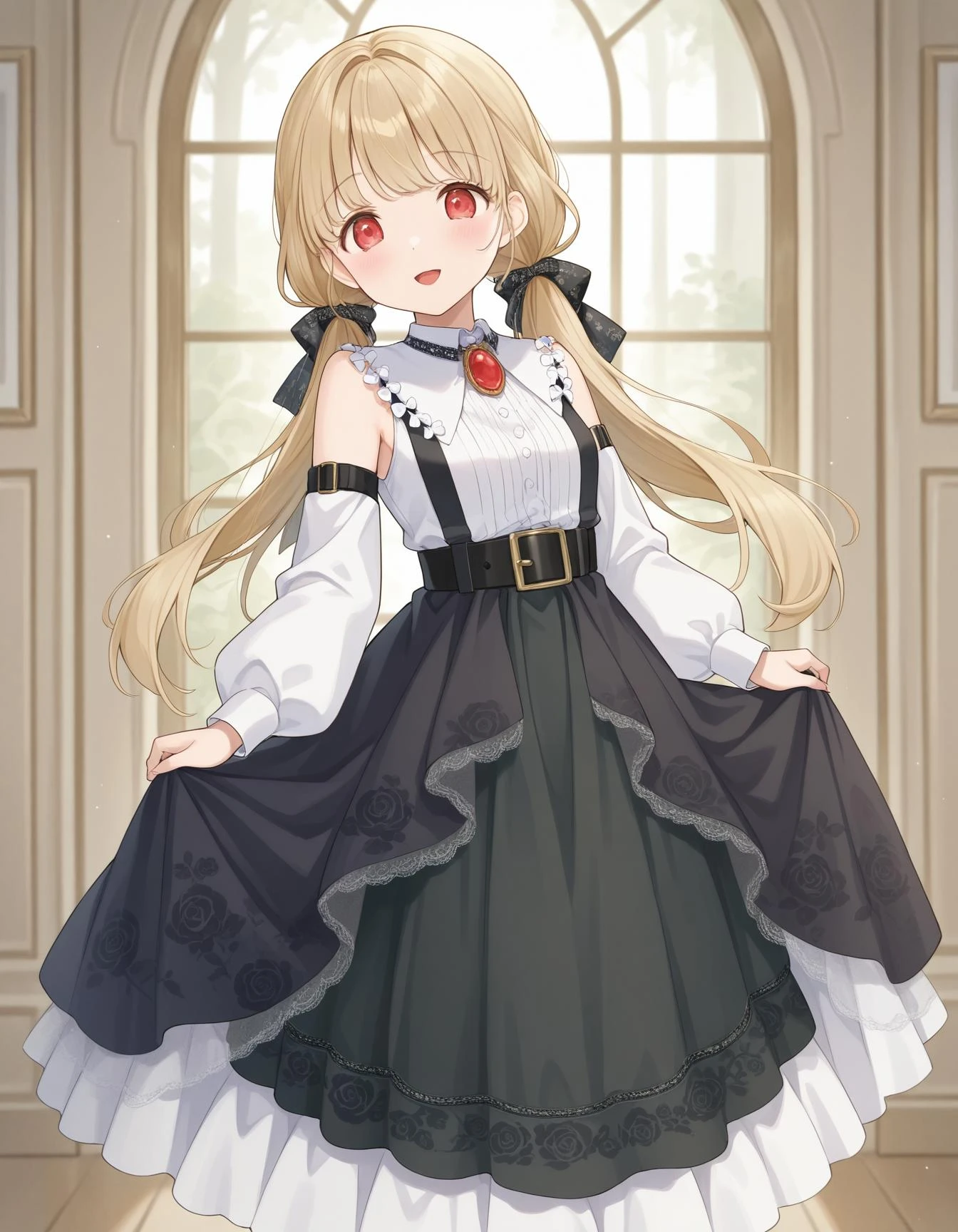 vspototo,small breasts,red eyes,blonde hair,low twintails,black bow,