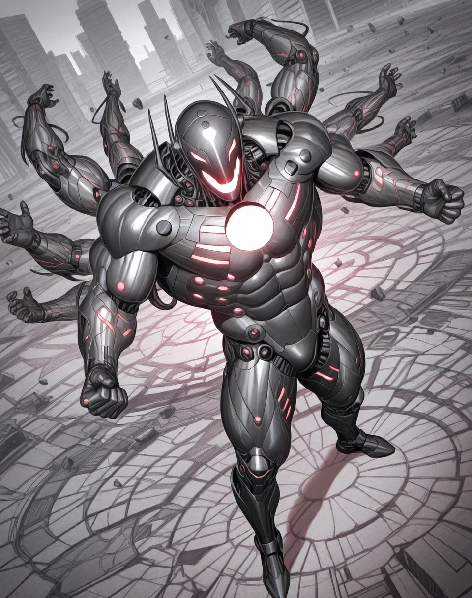 Sometimes adding additional prompts like ( multiple arm, ) can help when making results similar to the covers that show Ultron with multiple arms.
