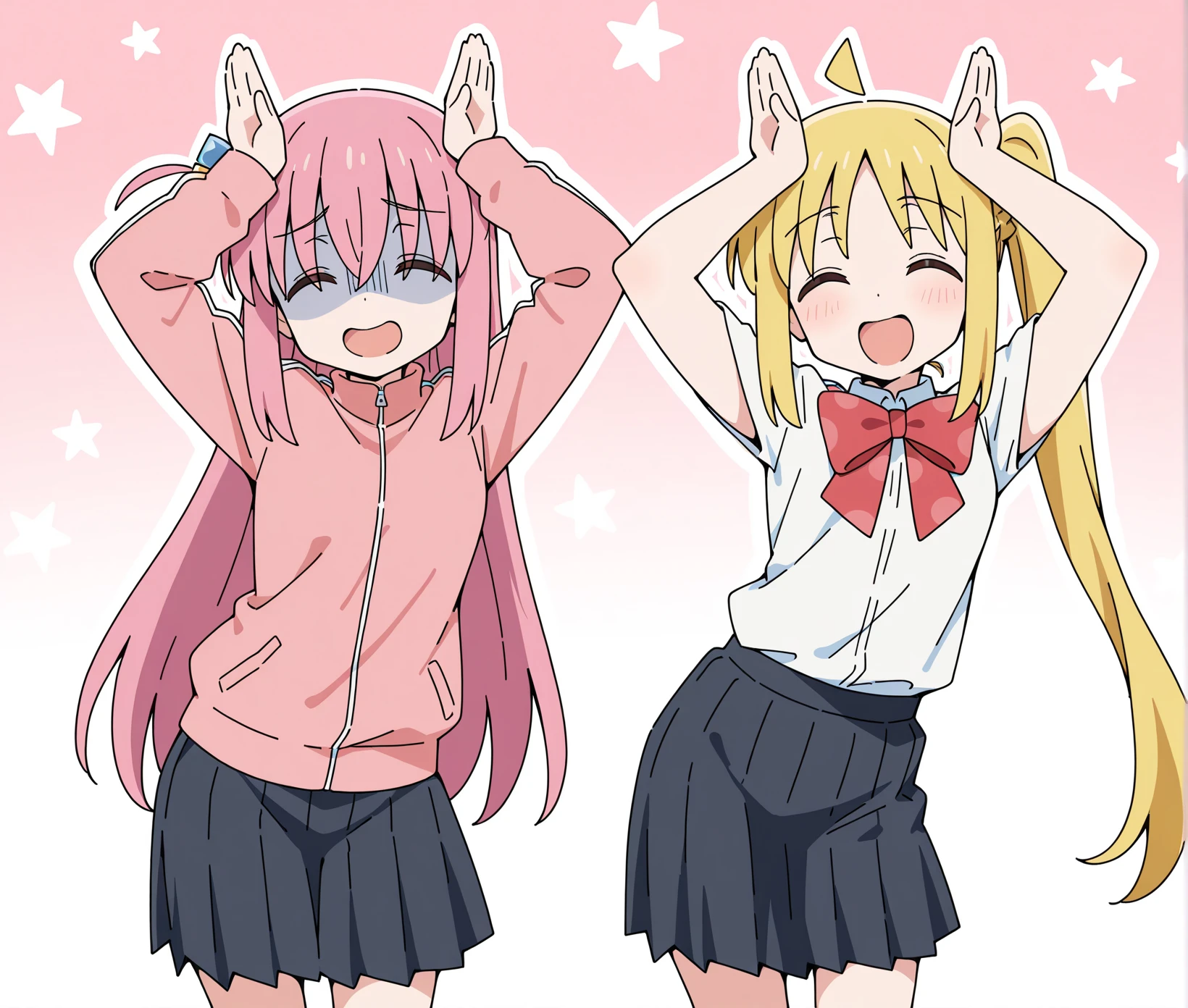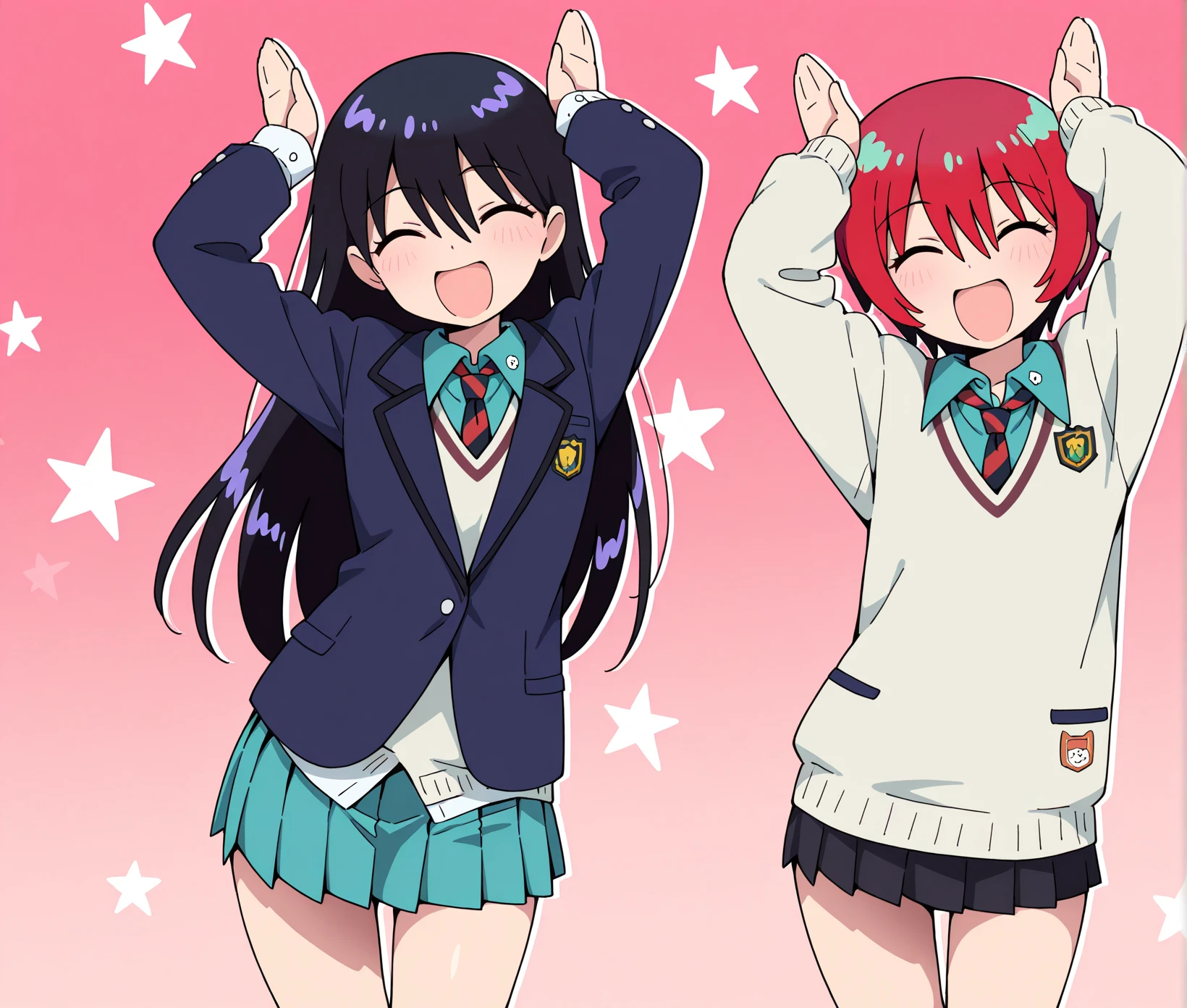 parody,smile,open mouth,^_^,arms up,closed eyes