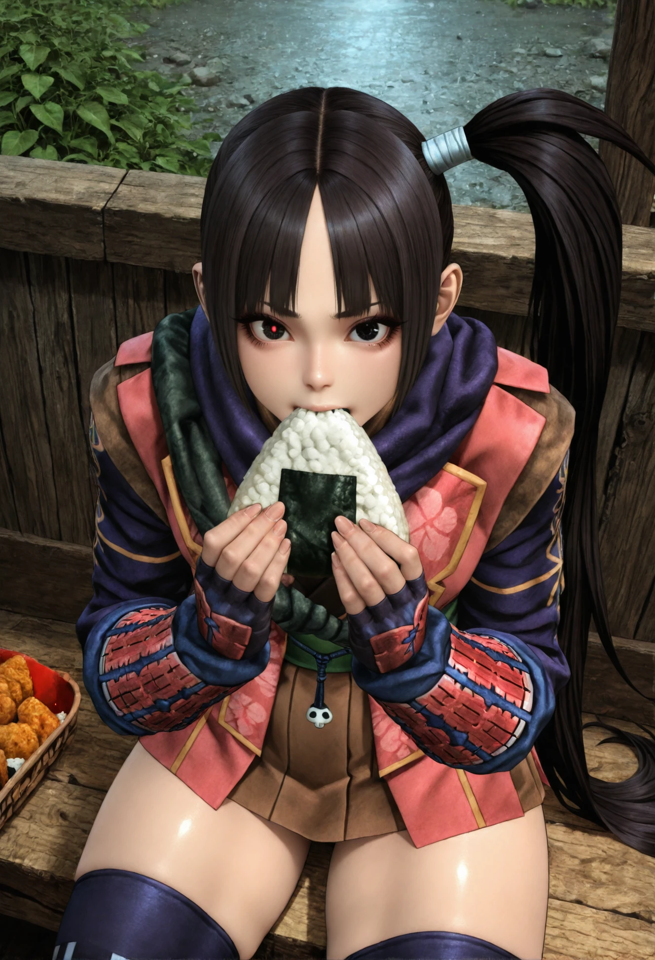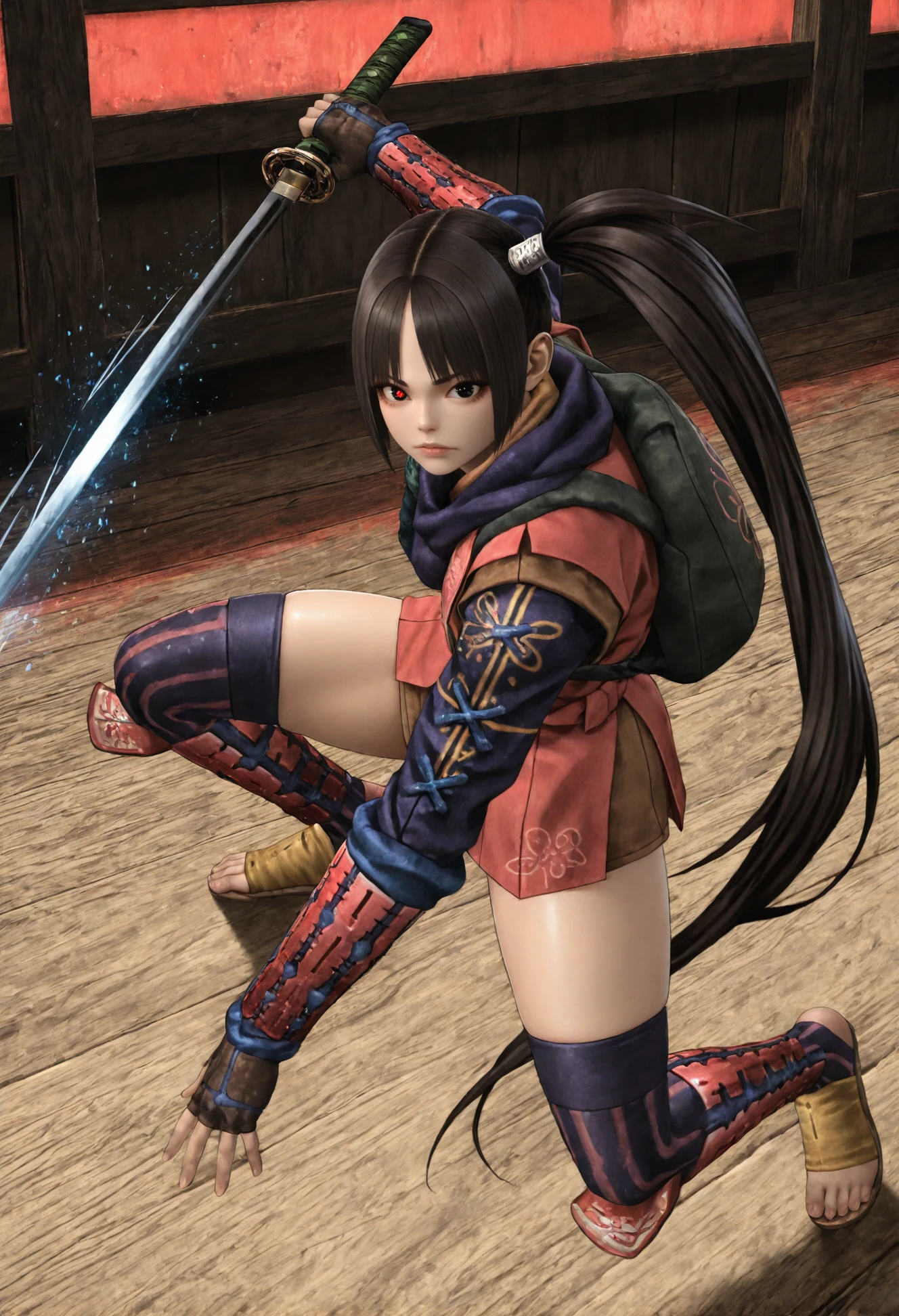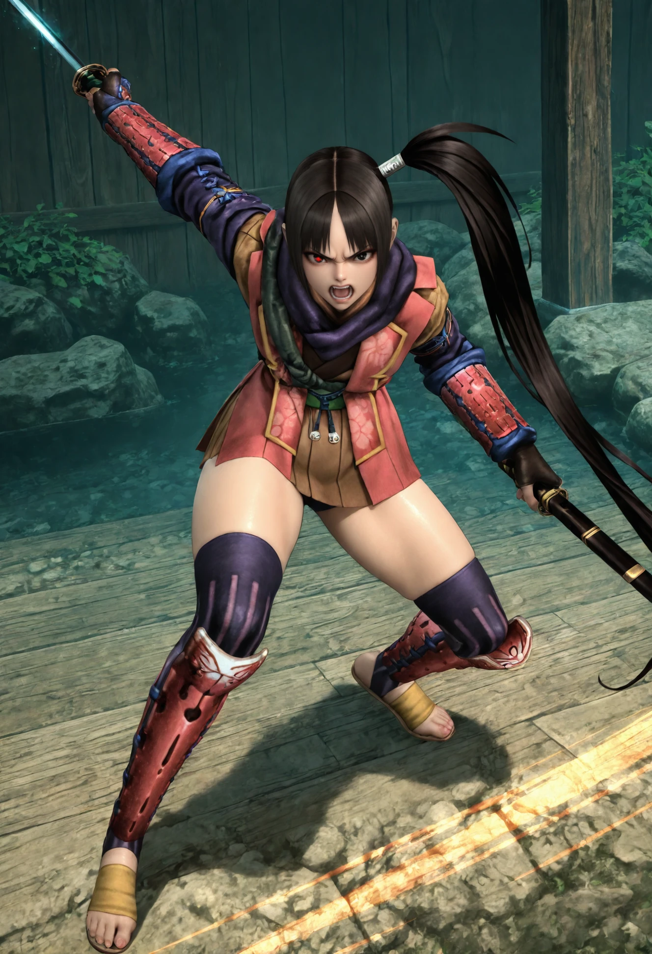 juubei akane,Side ponytail,very long hair,black hair,centre parting bangs,heterochromia,scarf,jacket,japanese armor,fingerless_gloves,hot_pants,thighhighs,shin guards,toeless legwear,sandals