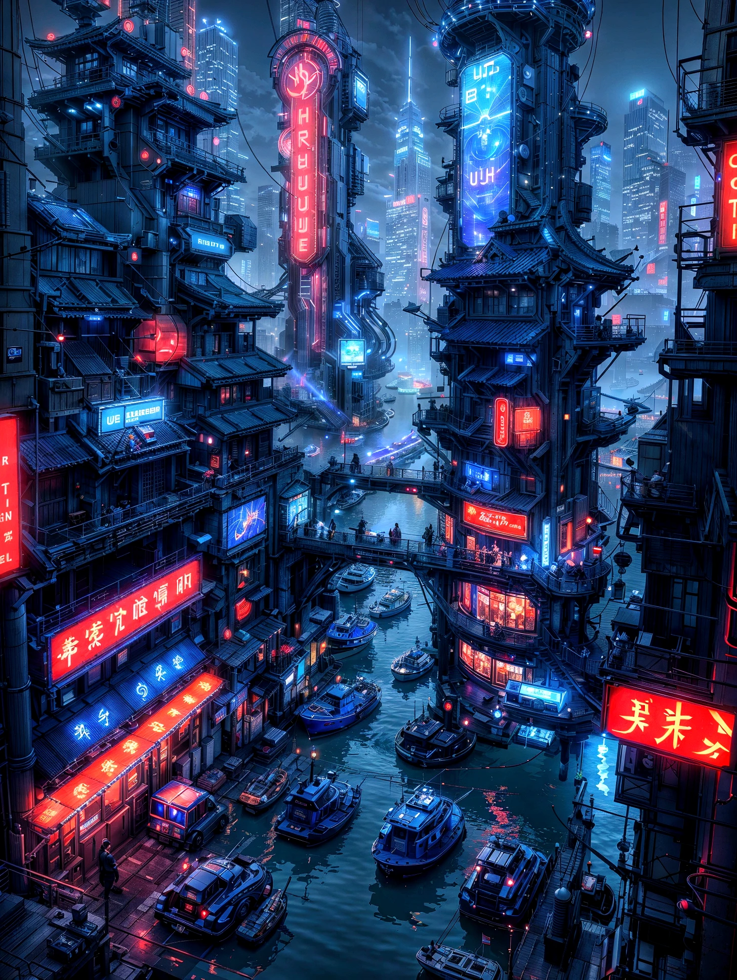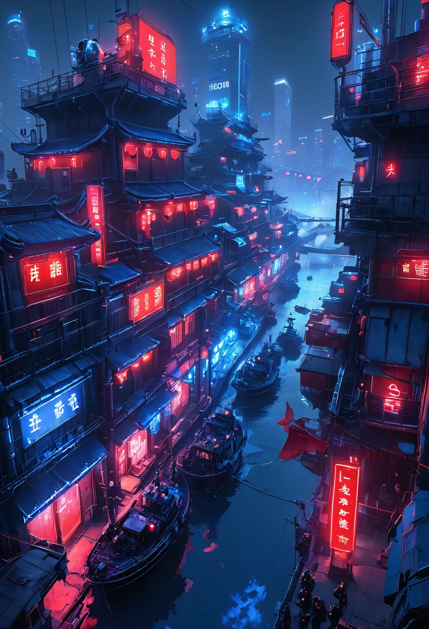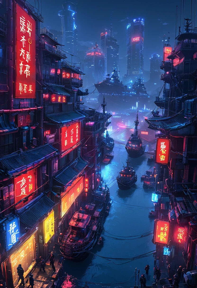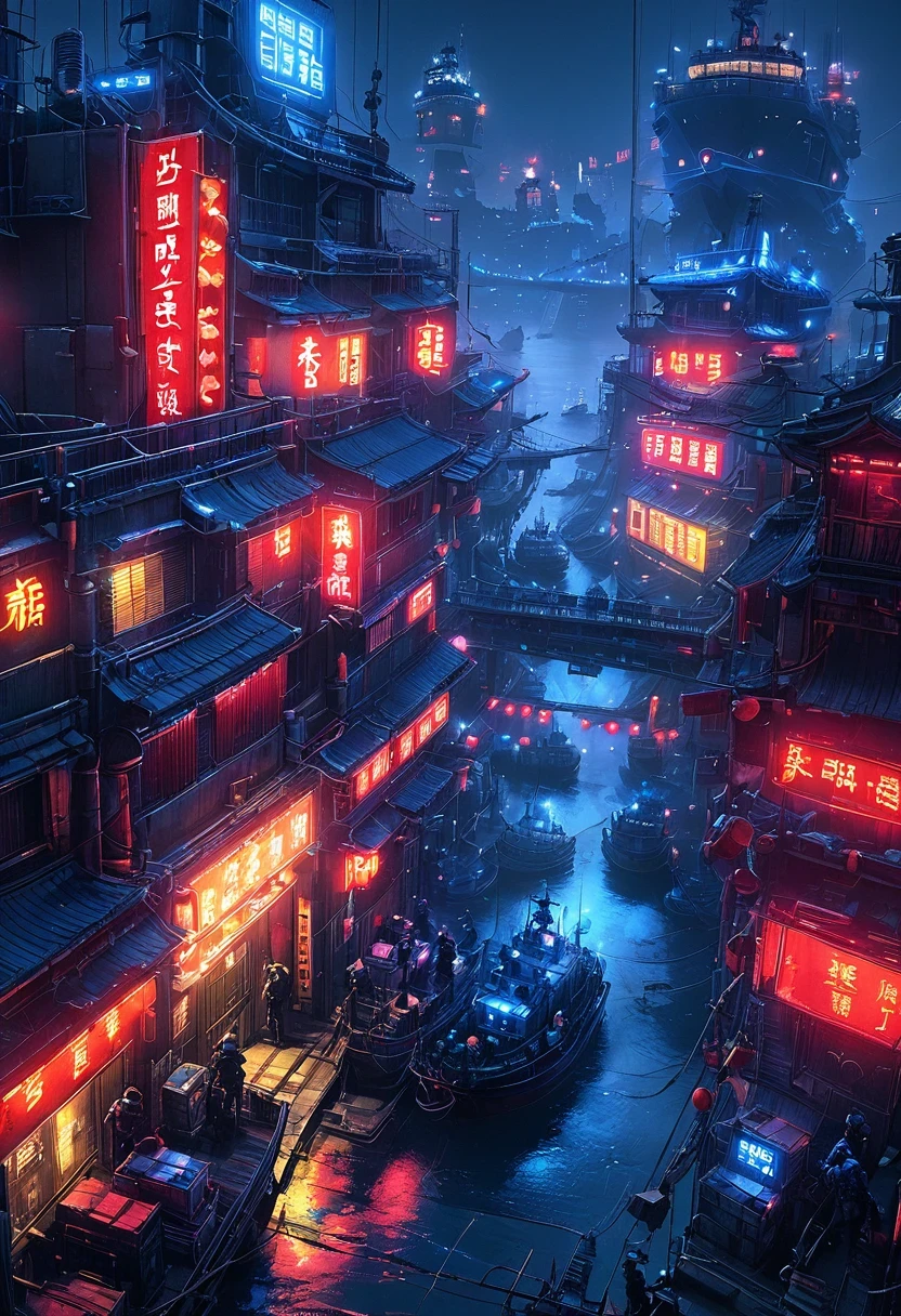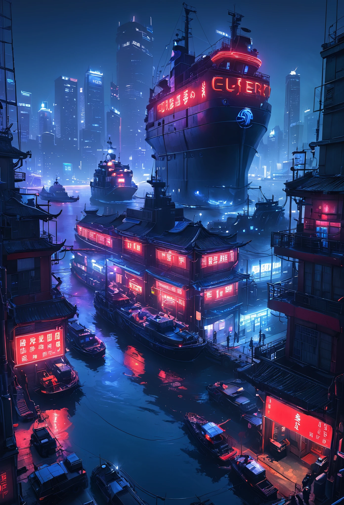 CyberCity, (blue:1.3), (red:1.4), (harbor:1.3), (ship:1.2), neon lights, scenery, chinese_building, outdoors, road, night, sign, street, riot police, criminals, (bird eye view:1.2),