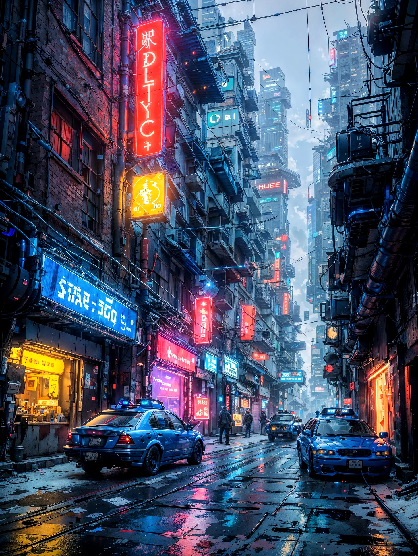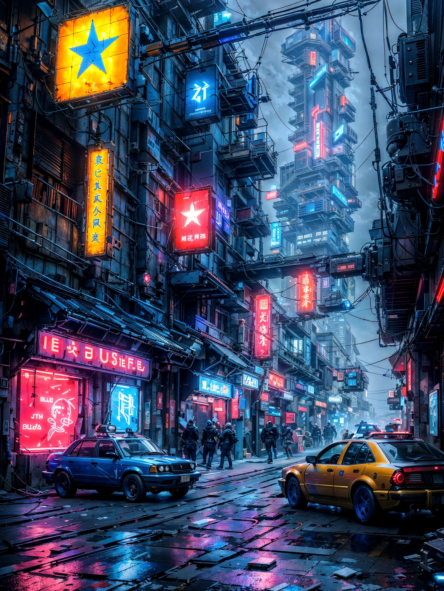 CyberCity, (yellow:1.3), (blue:1.3), (red:1.4), neon lights, outdoors, road, snowing, sign, riot_police, (Star_Port:1.3), criminals,