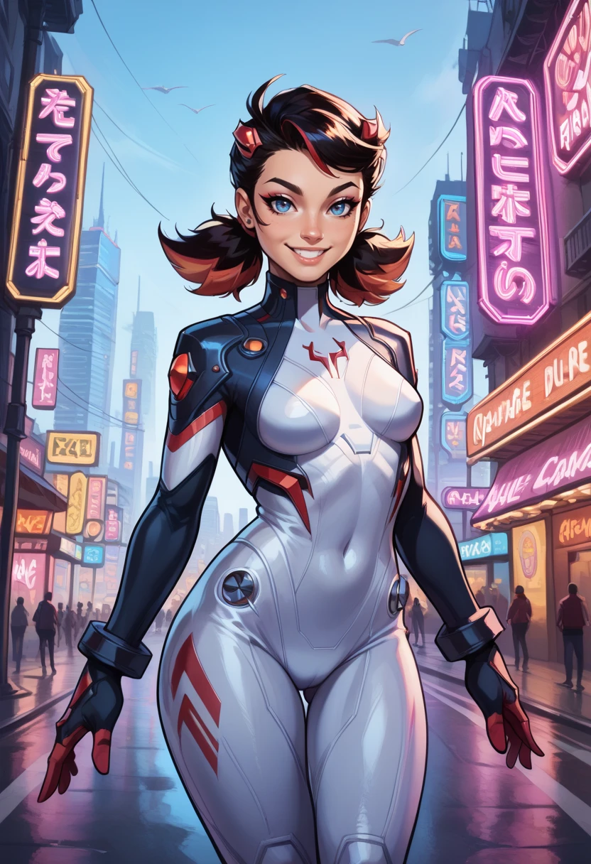 peni parker, black hair, red hair, multicolored hair, twintails, blue eyes, skin tight, white pilot suit, red accents, gloves, large smile,