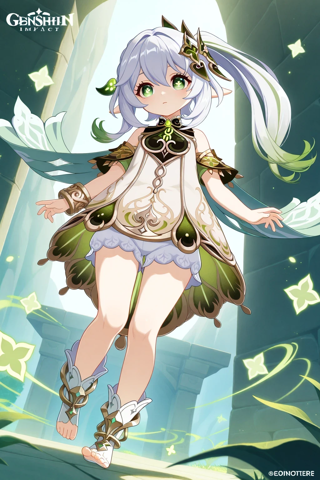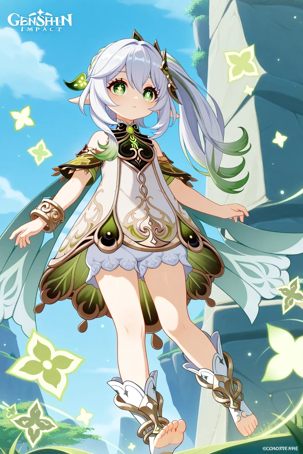 Nahida (Genshin Impact), green_eyes, white_hair, gradient_hair, long_hair, cross-shaped_pupils, side_ponytail, flat_chest, pointy_ears, thighs, white dress, bracelet, detached_sleeves, gold_trim, green_cape, green_sleeves, leaf_hair_ornament, short_sleeves, sleeveless_dress, white_bloomers, white_dress, toeless footwear