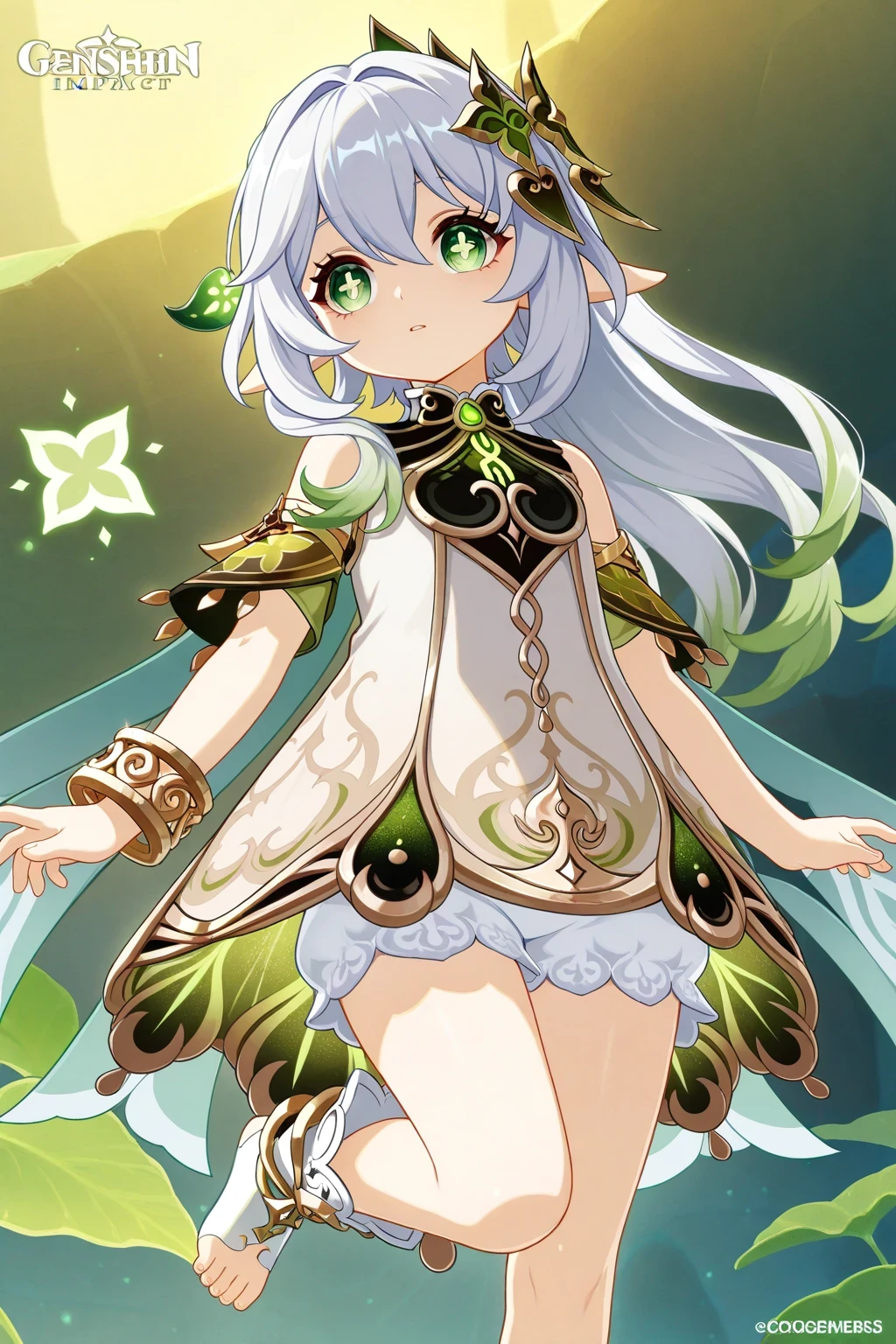 Nahida (Genshin Impact), green_eyes, white_hair, green_hair, hair_between_eyes, gradient_hair, hair_intakes, long_hair, side_ponytail, sidelocks, cross-shaped_pupils, pointy_ears, thighs, white dress, bracelet, detached_sleeves, gold_trim, green_cape, green_sleeves, leaf_hair_ornament, short_sleeves, sleeveless_dress, white_bloomers, white_dress, toeless footwear