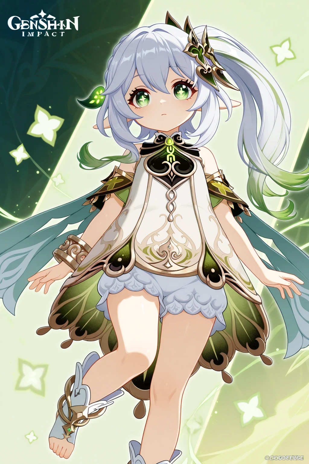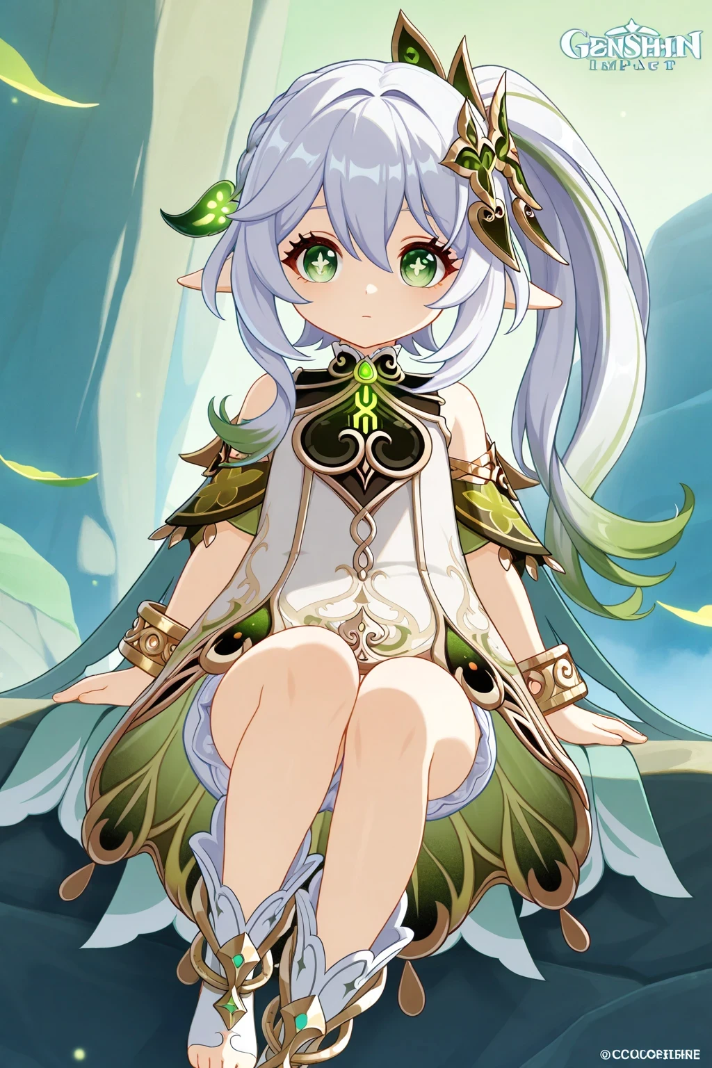 Nahida (Genshin Impact), green_eyes, white_hair, green_hair, hair_between_eyes, gradient_hair, hair_intakes, long_hair, side_ponytail, sidelocks, cross-shaped_pupils, pointy_ears, thighs