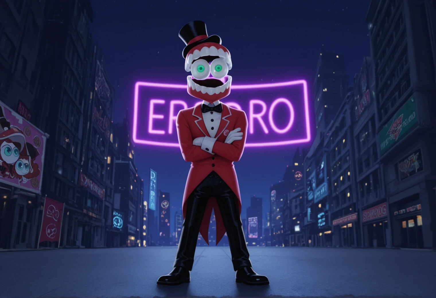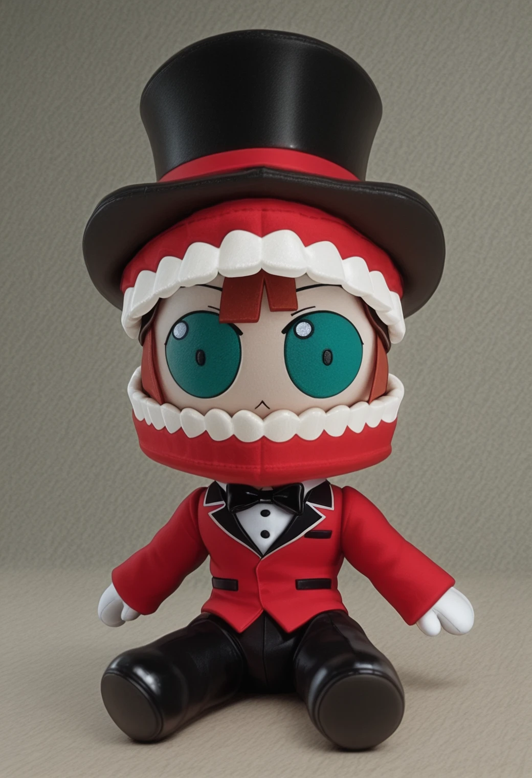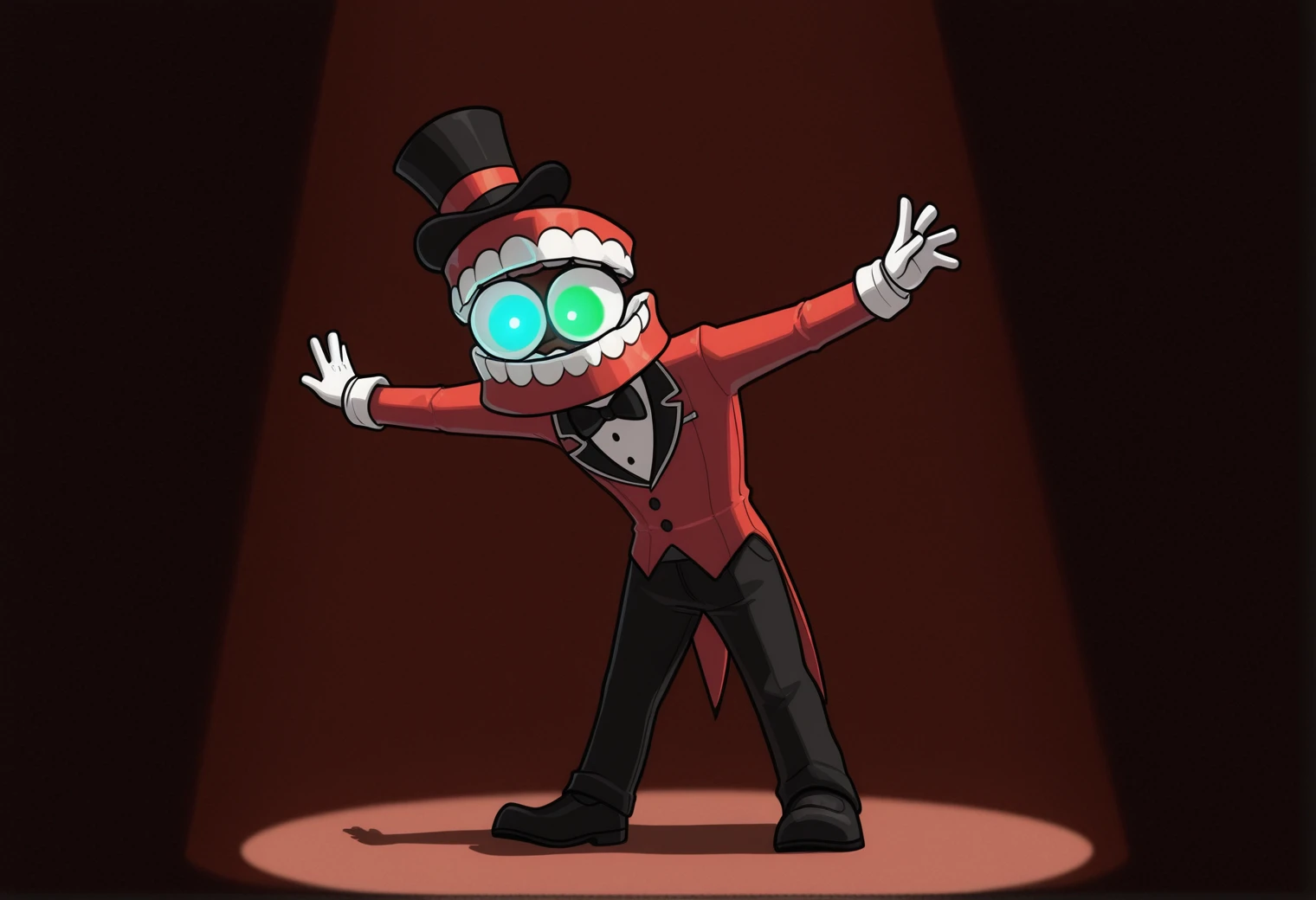 tadc_caine, large red jaw with white teeth as its head, black top hat, red suit jacket, black lapels, white shirt, black bow tie, black pants, black shoes, white gloves