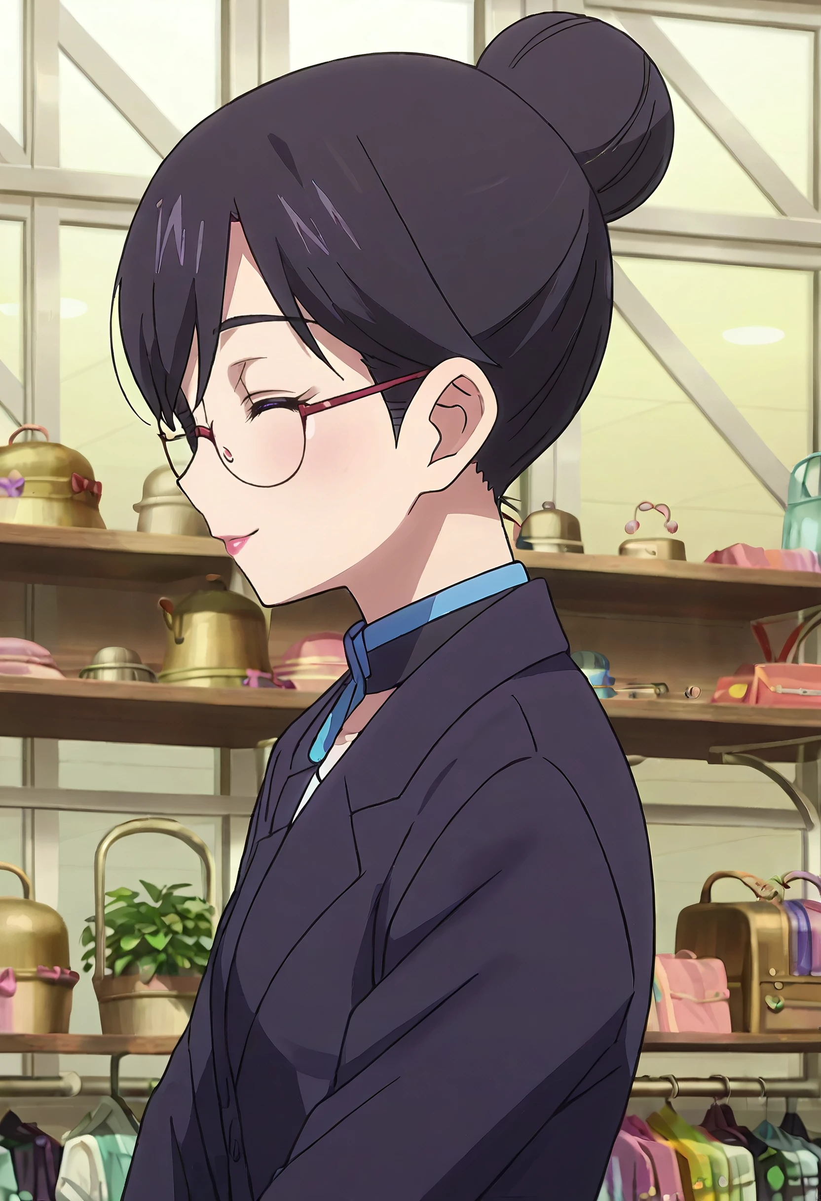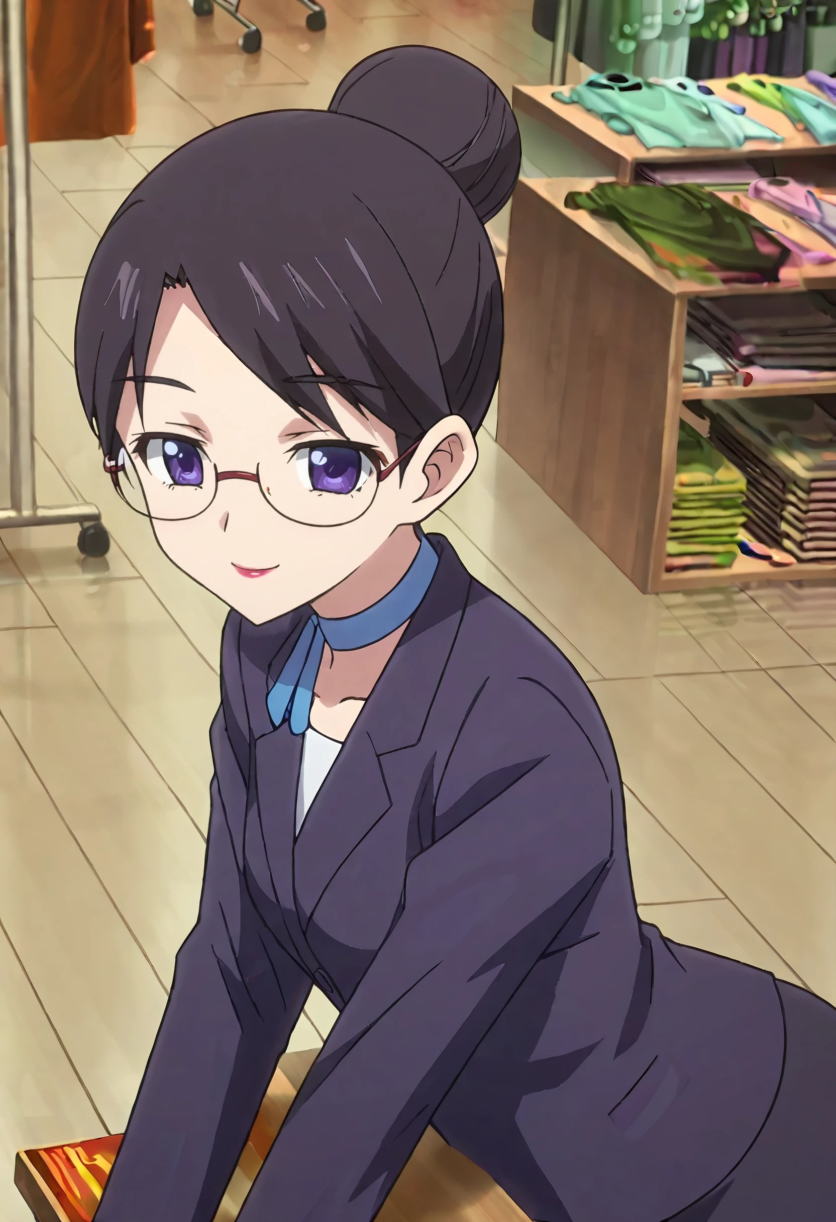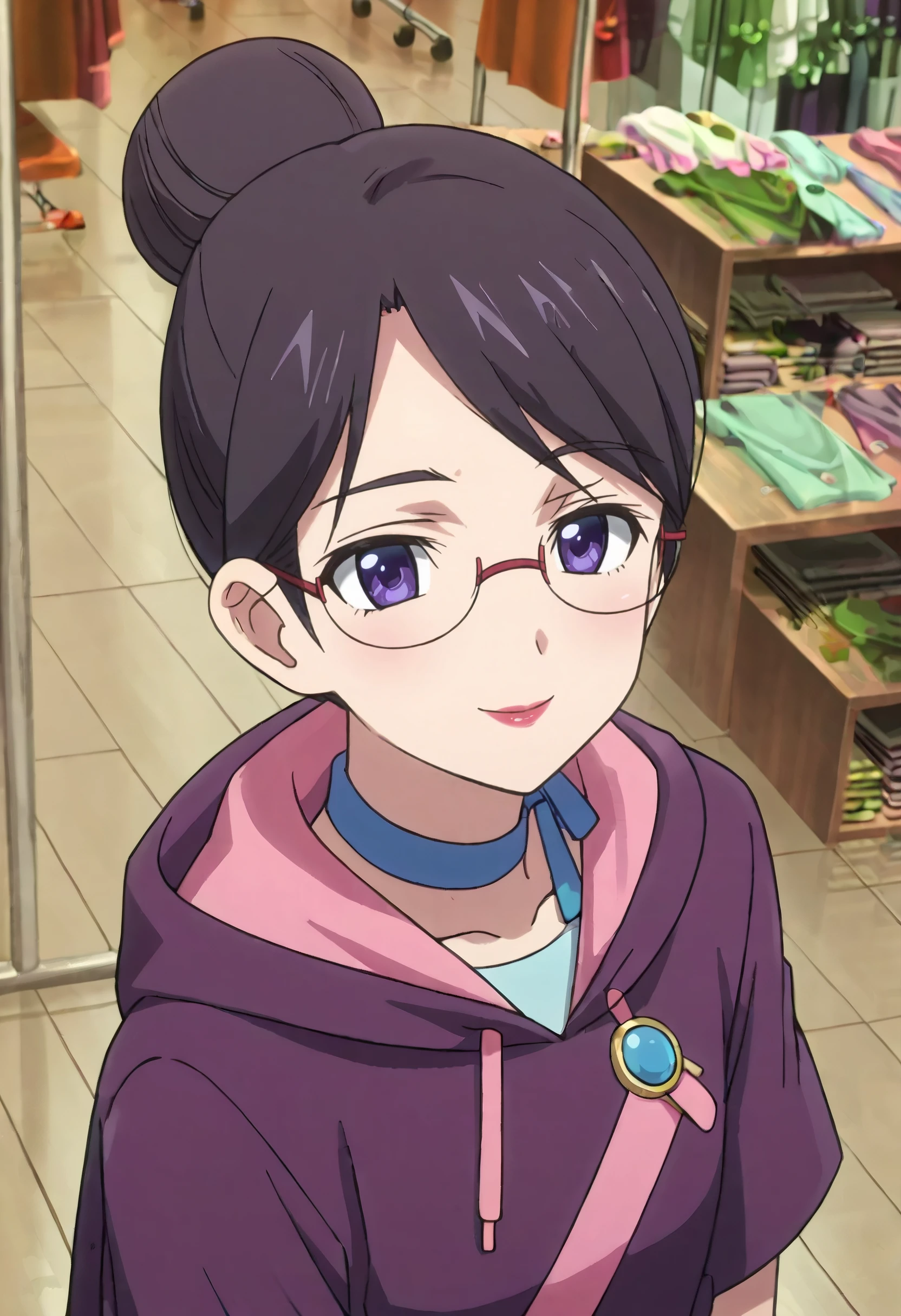 ISt0wner, glasses, short hair, hair bun, black hair, single hair bun, purple eyes, semi-rimless eyewear, lipstick, makeup,