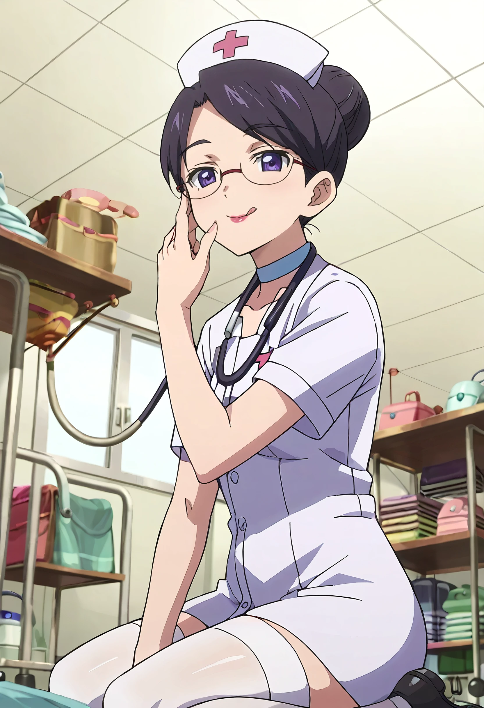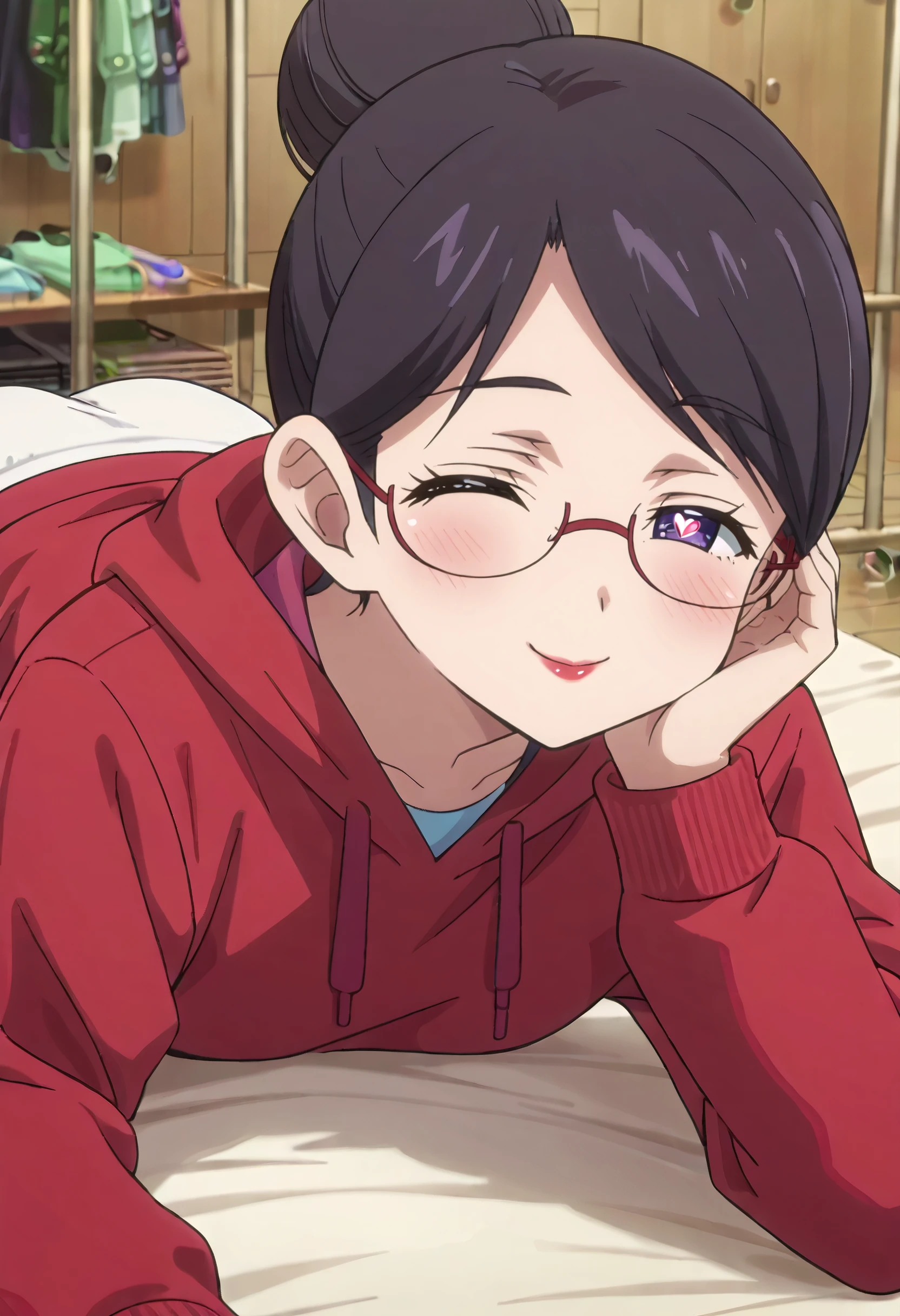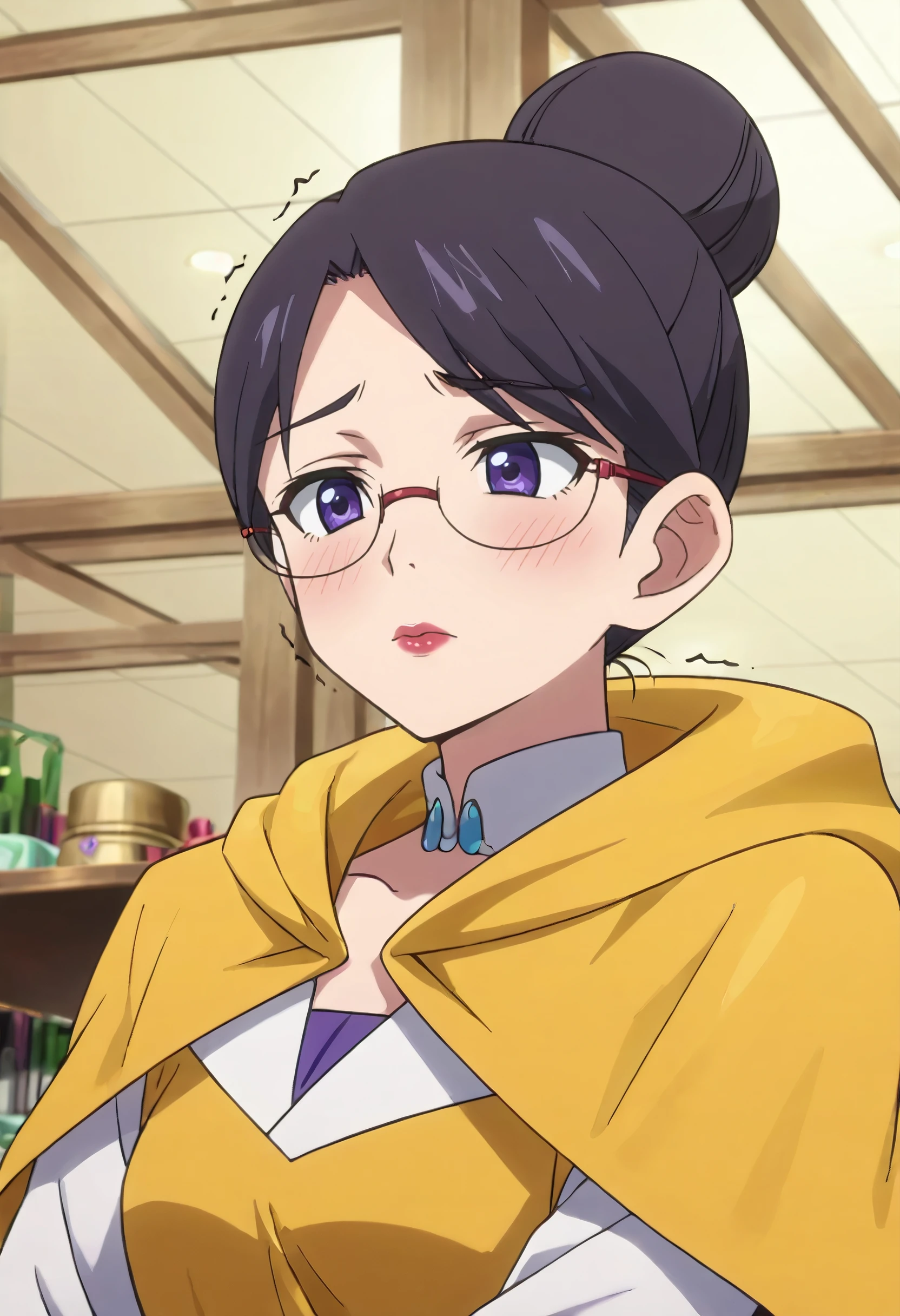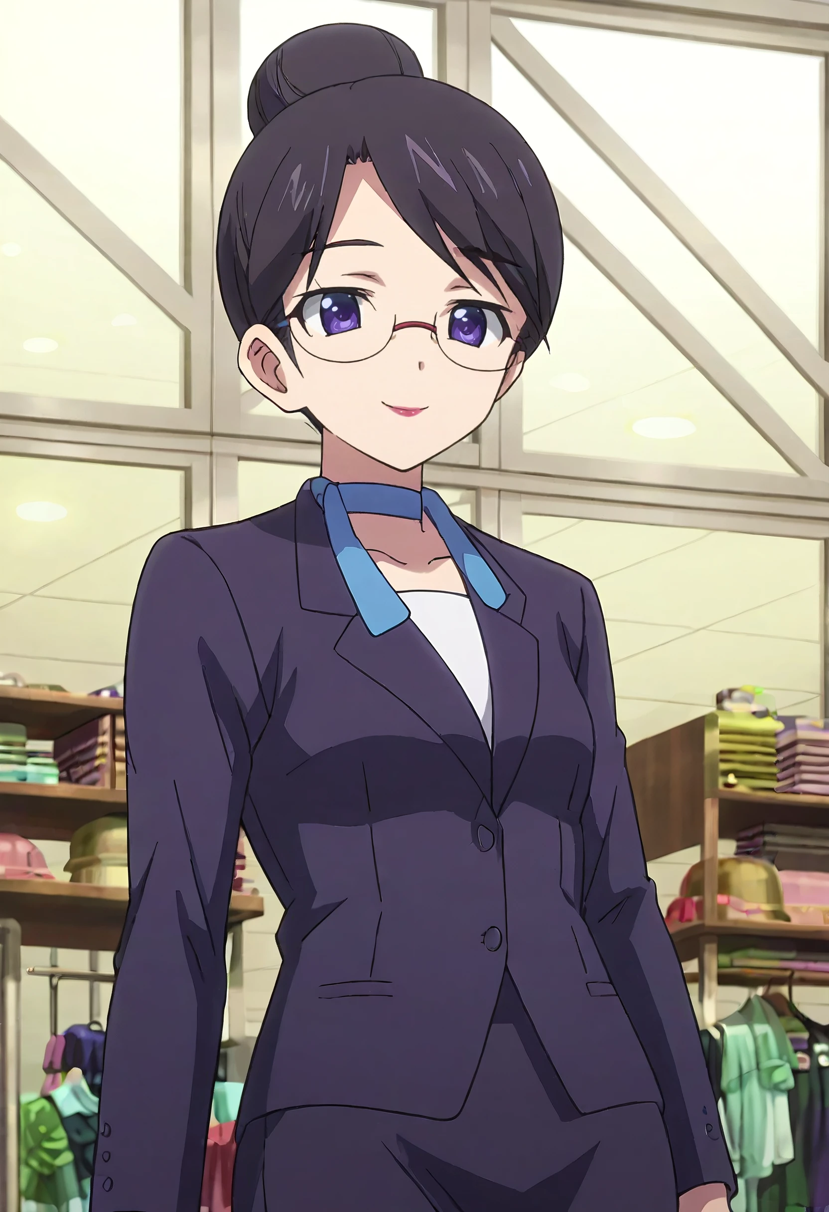 ISt0wner, glasses, short hair, hair bun, black hair, single hair bun, purple eyes, semi-rimless eyewear, lipstick, makeup,