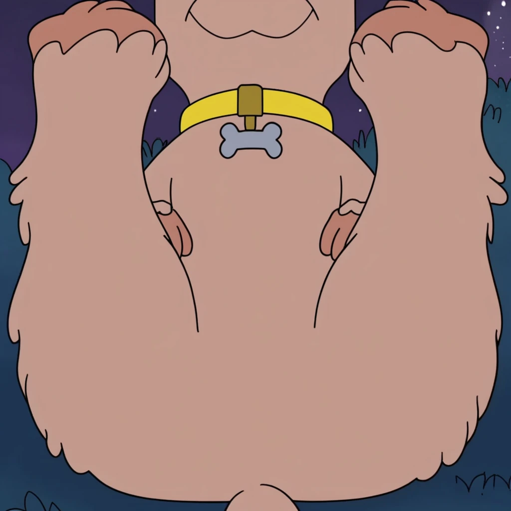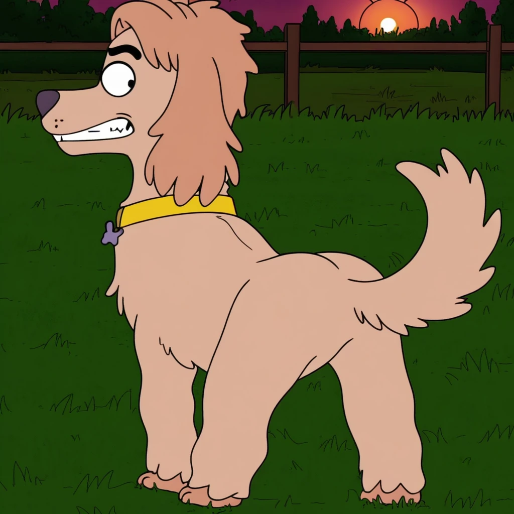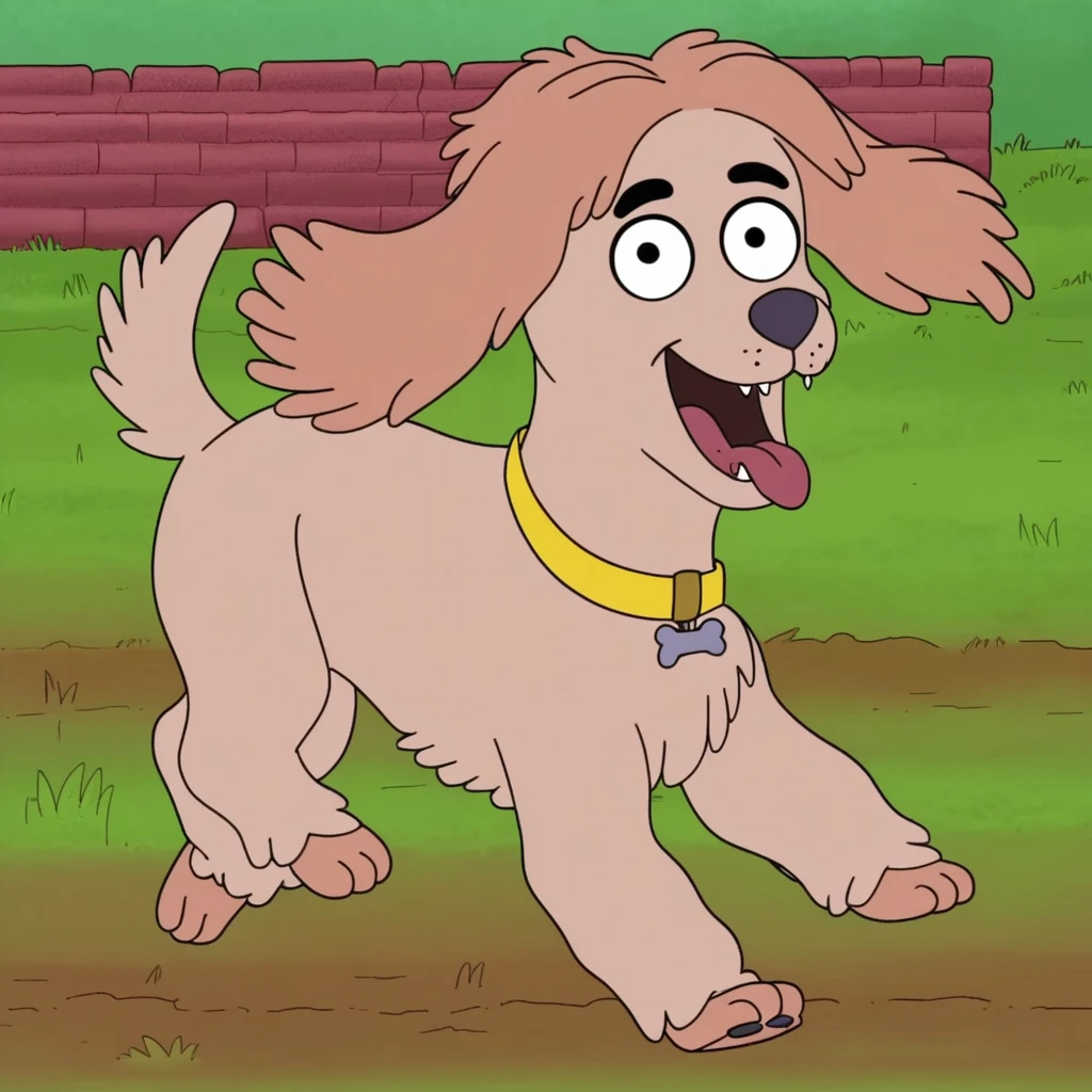 Prompt: little cookie, feral, solo, adult form, puppy form, black eyes, bone shaped dog tag, yellow collar,