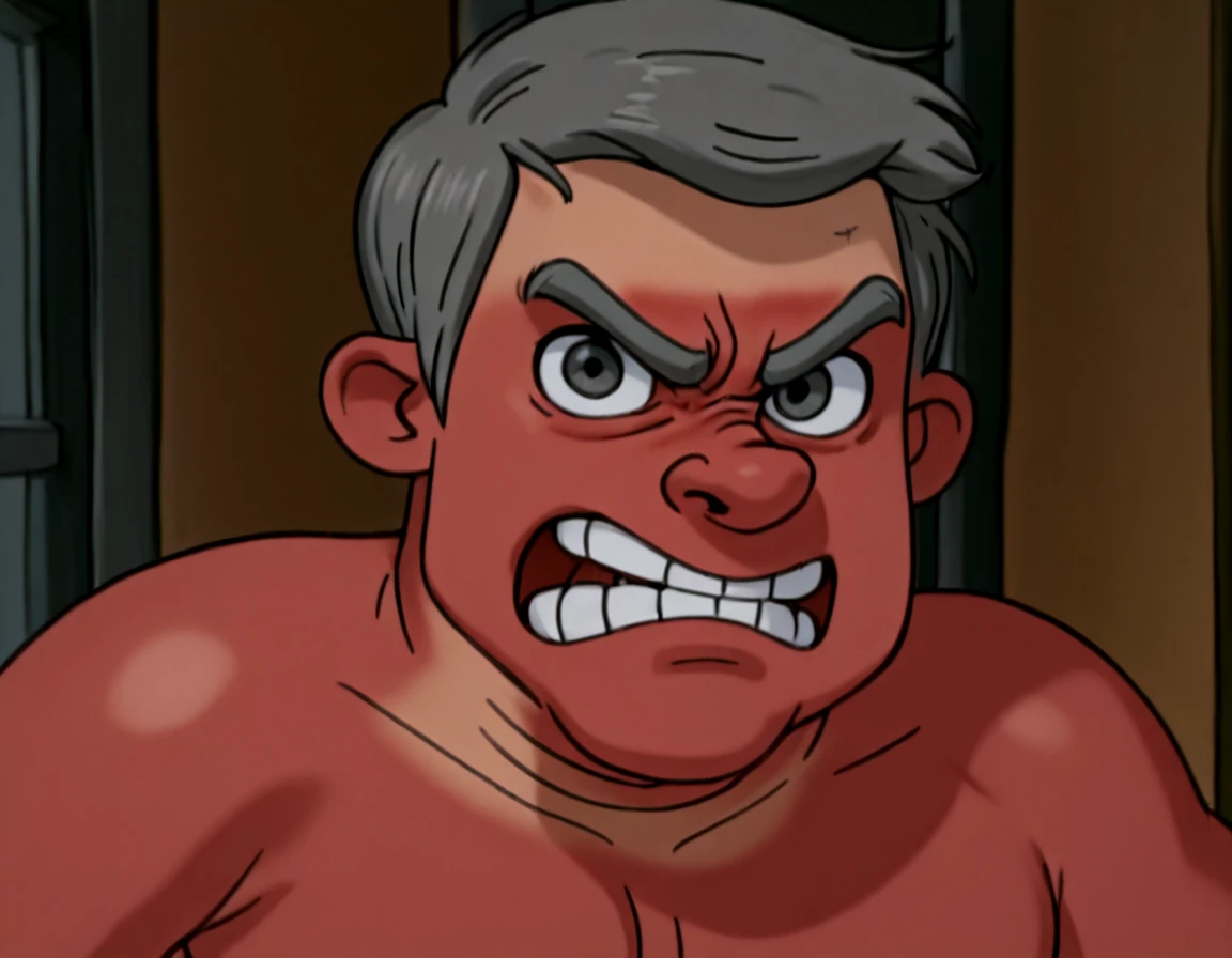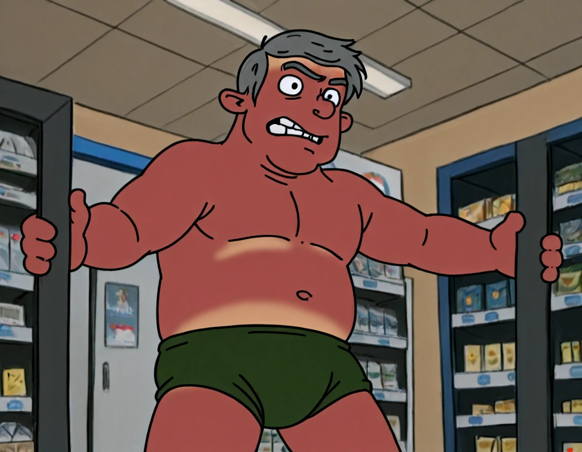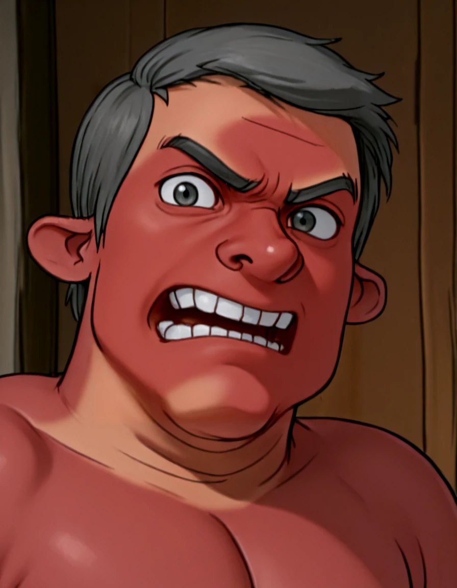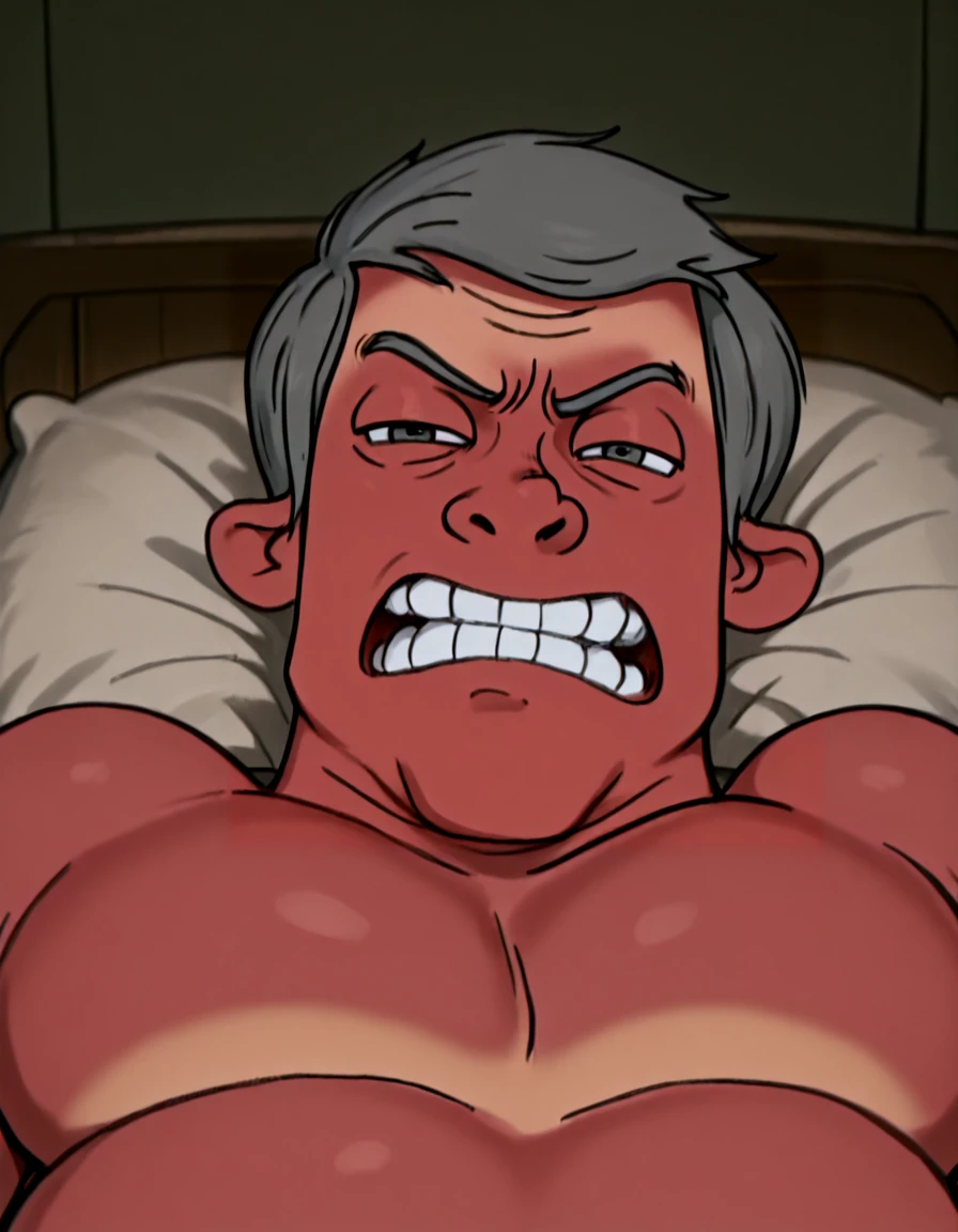 1boy, bad sunburn, green swimsuit, male focus, gray hair, short hair, solo, pain, navel, teeth, indoors, grin, black eyes, colored skin, topless male,
