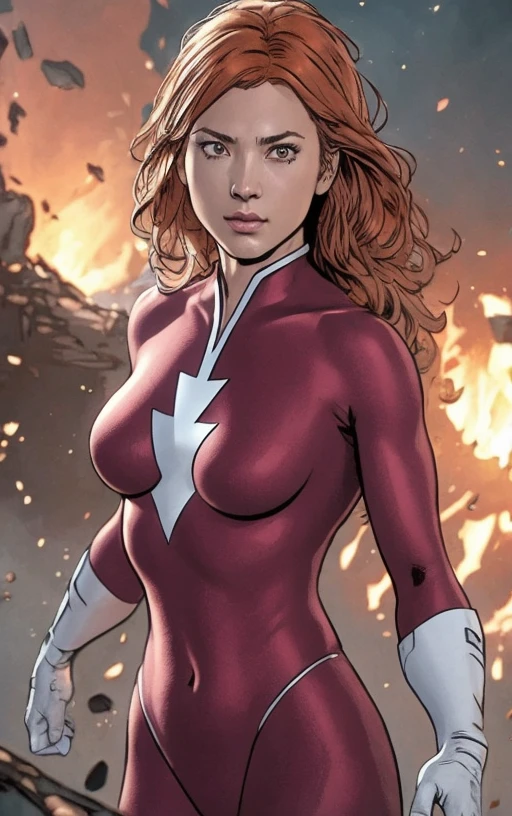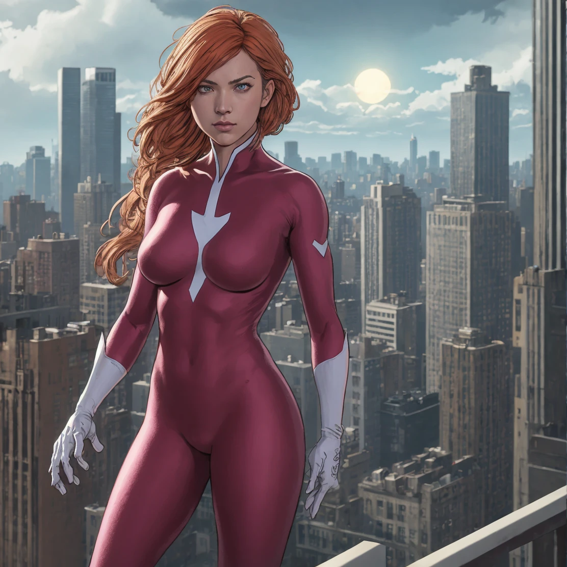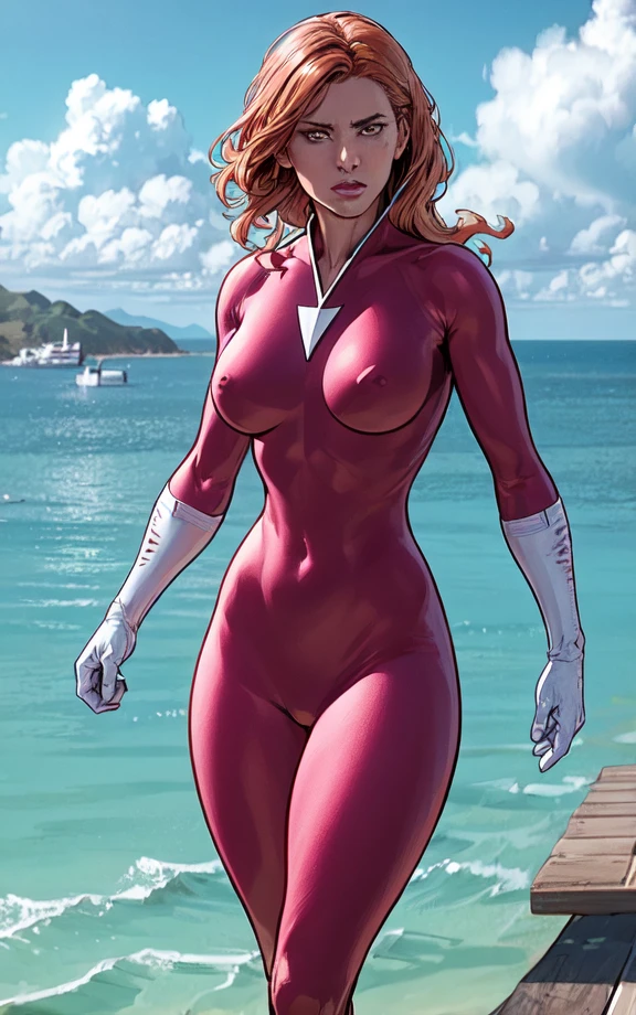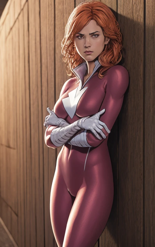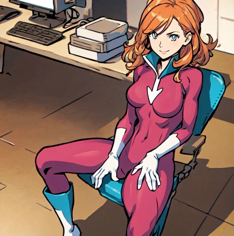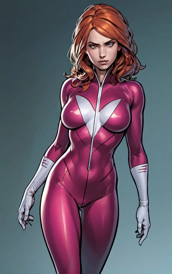 plastique, orange hair, green eyes, pink bodysuit, white gloves, arrow symbol on chest,