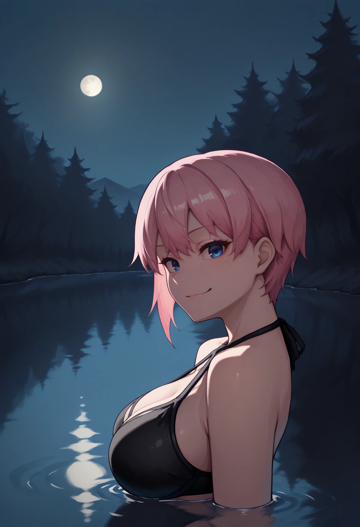 IchkSmmr, blue eyes, pink hair, short hair, black bikini, halterneckCasual Outfit: