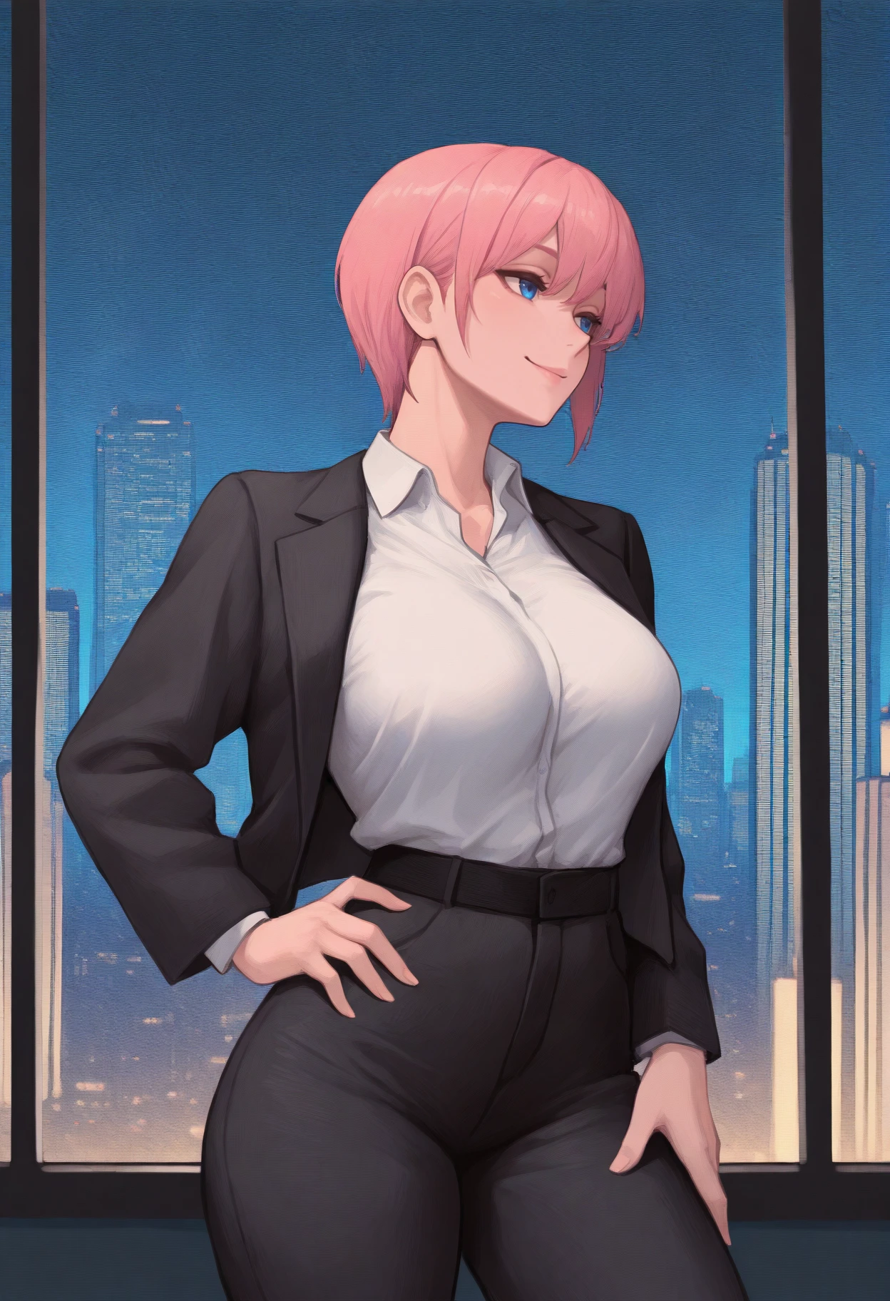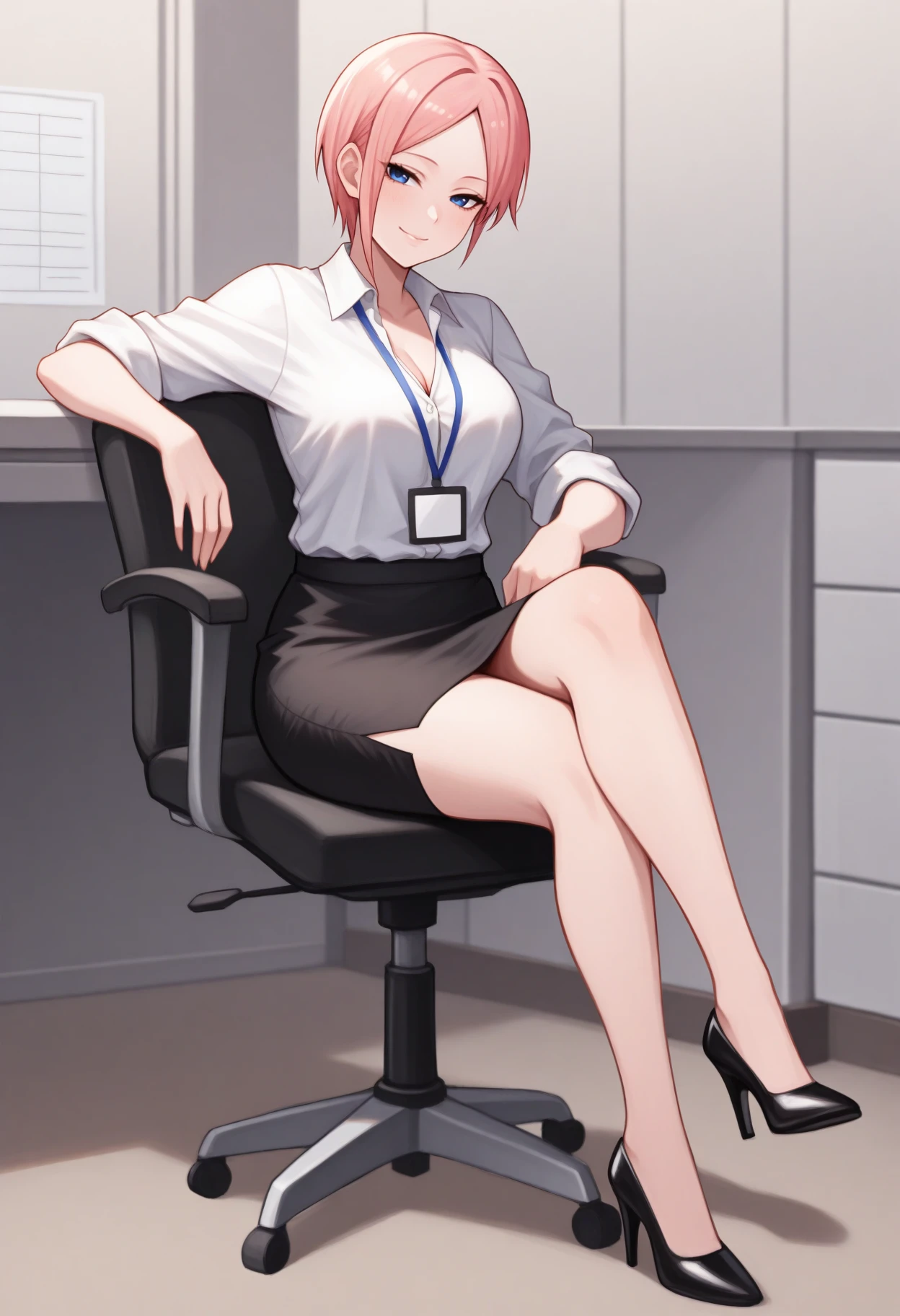 NknIchik, blue eyes, pink hair, short hair, parted bangs, white shirt, dress shirt, sleeves rolled up, lanyard, pencil skirt, medium skirt, black skirtLet me know if you have any issues.