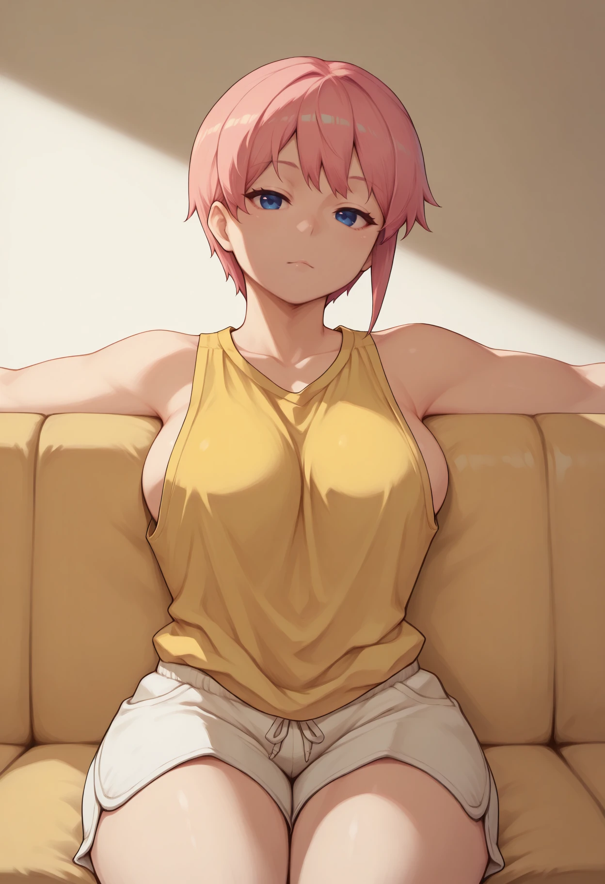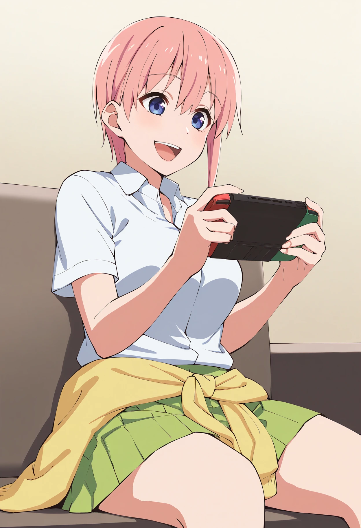 IchkDef, blue eyes, pink hair, short hair, dress shirt, white shirt, short sleeves, green skirt, yellow sweater around waistSummer Outfit: