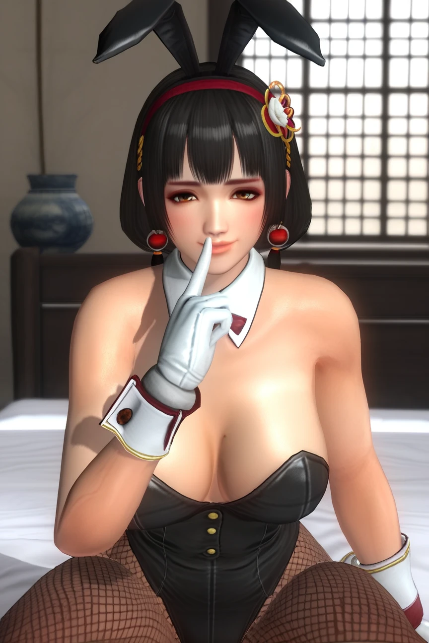 -ayane ninja outfit, fingerless gloves, bare shoulders, elbow gloves, fishnets, (optional:open legs, open hips, black panty)