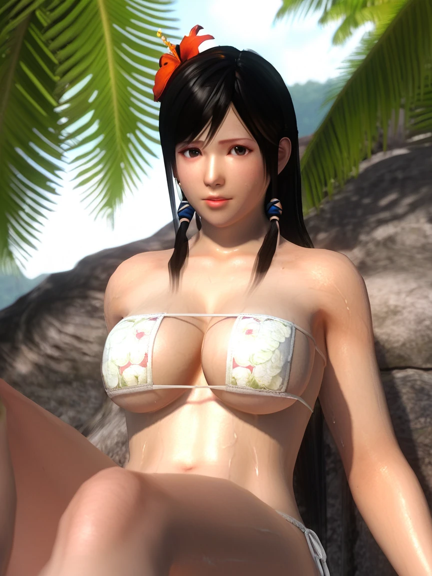 Kokoro - kokoro, black hair, long hair,hair flower, hibiscus, black eyes, big breasts