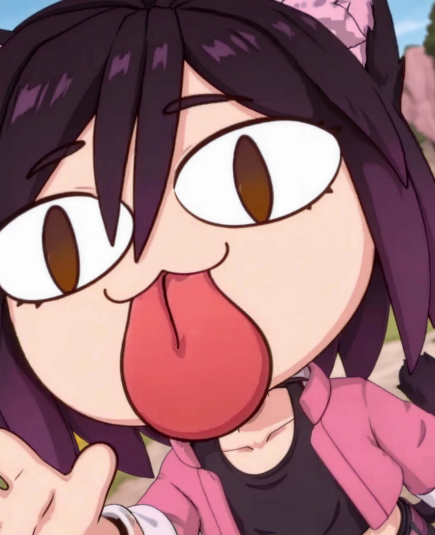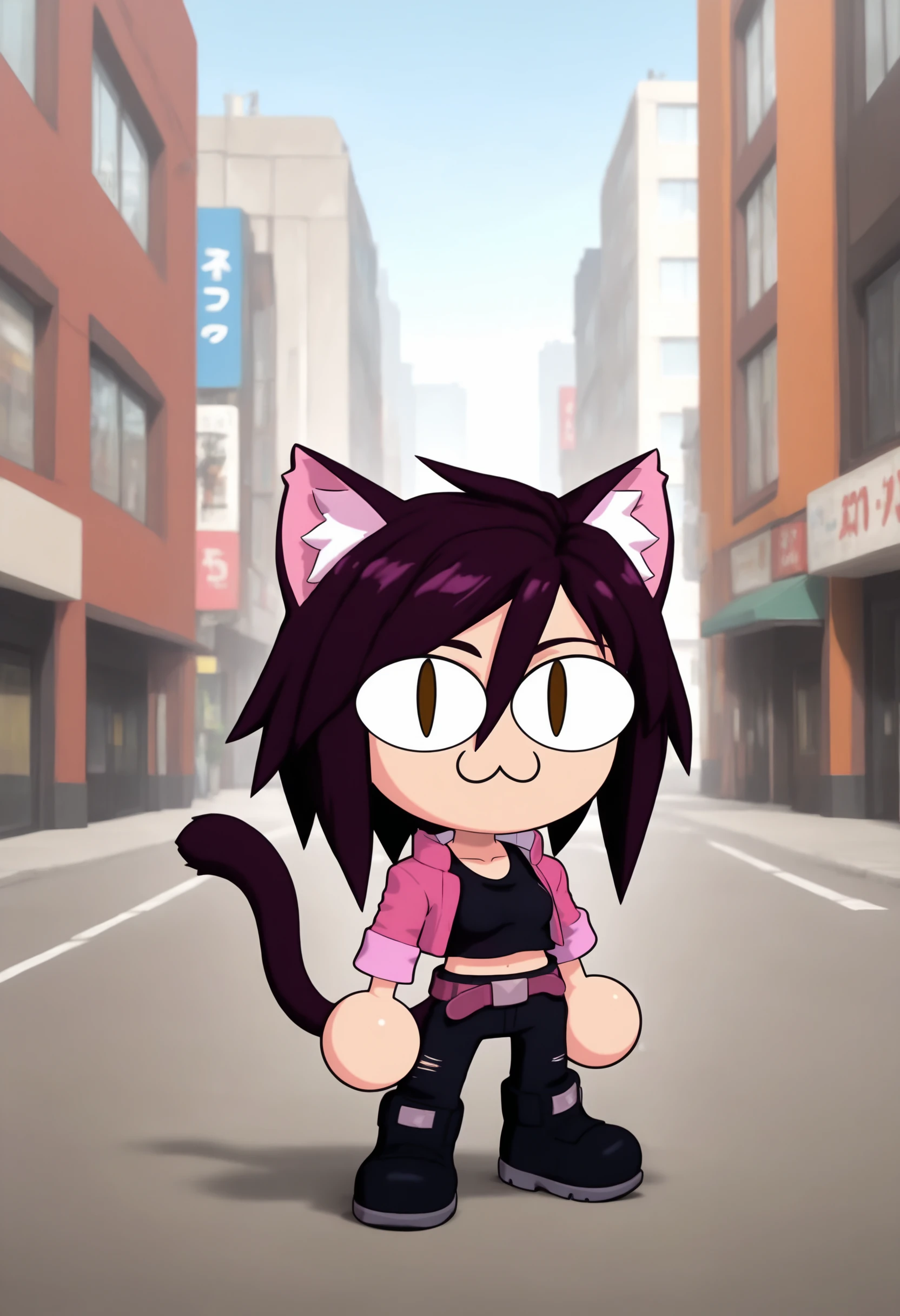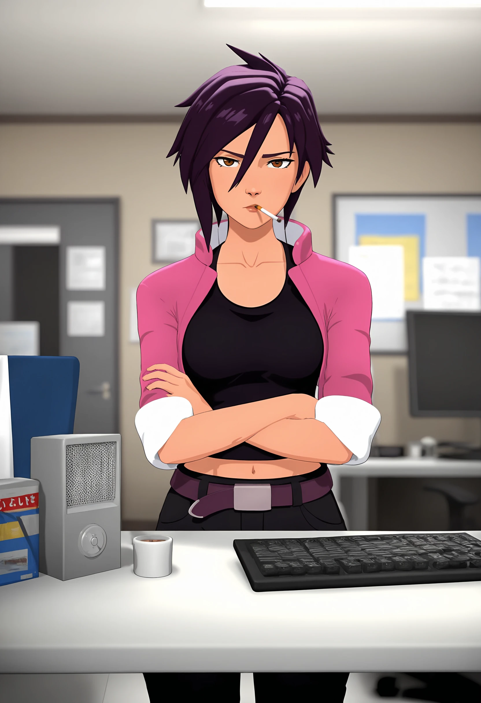 FOR HER ATTIRE: navel, midriff, crop top, cropped jacket, shirt, pink jacket, black shirt, collarbone, belt, black pants,