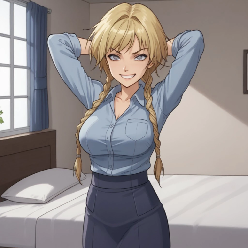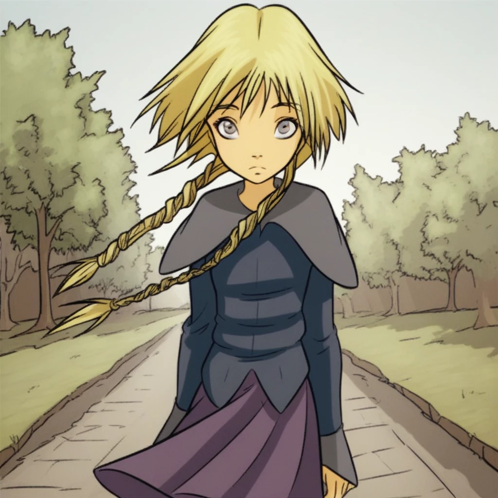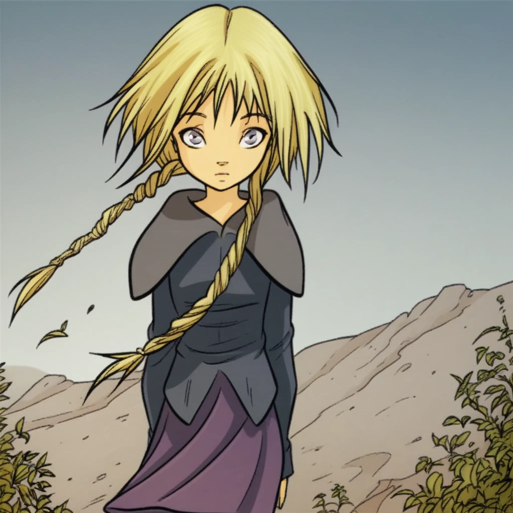 elyon, blonde hair, twin braid, grey eyes, skirt