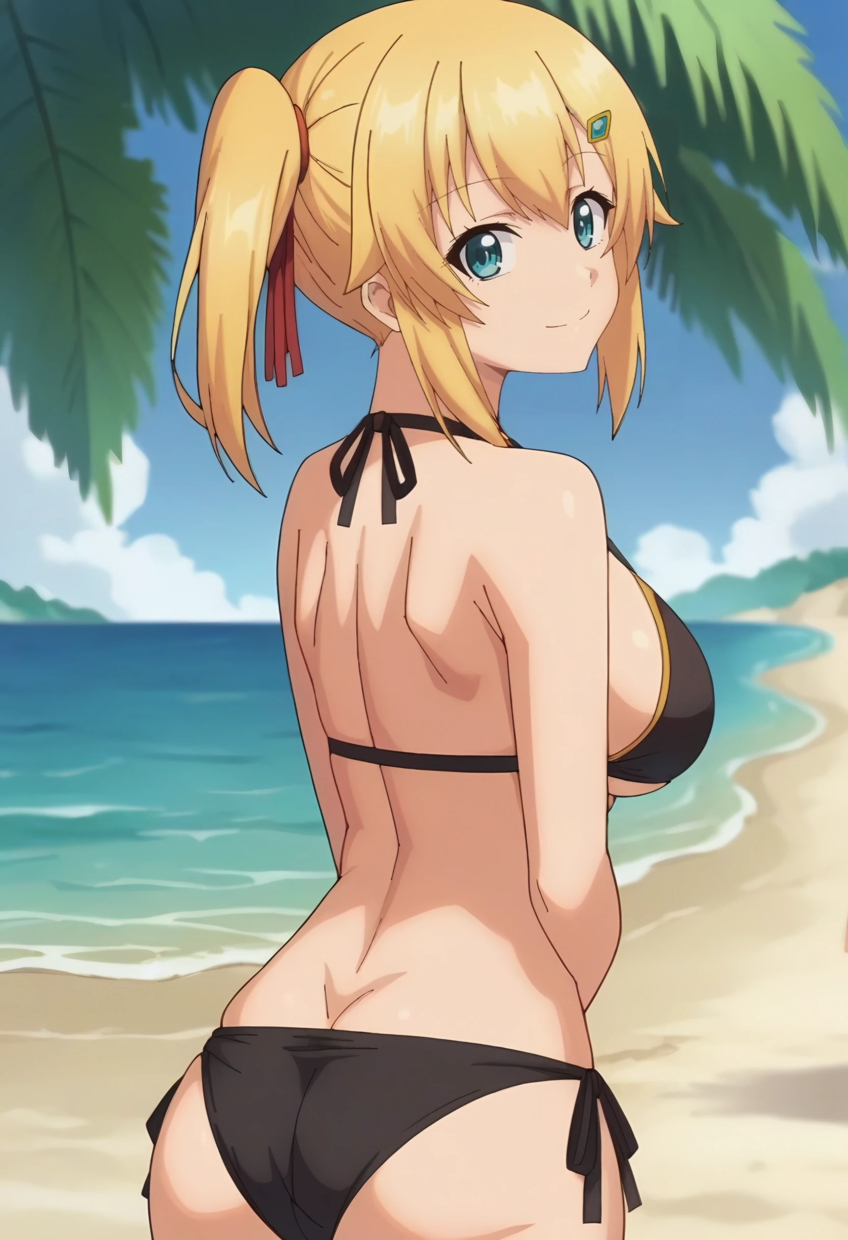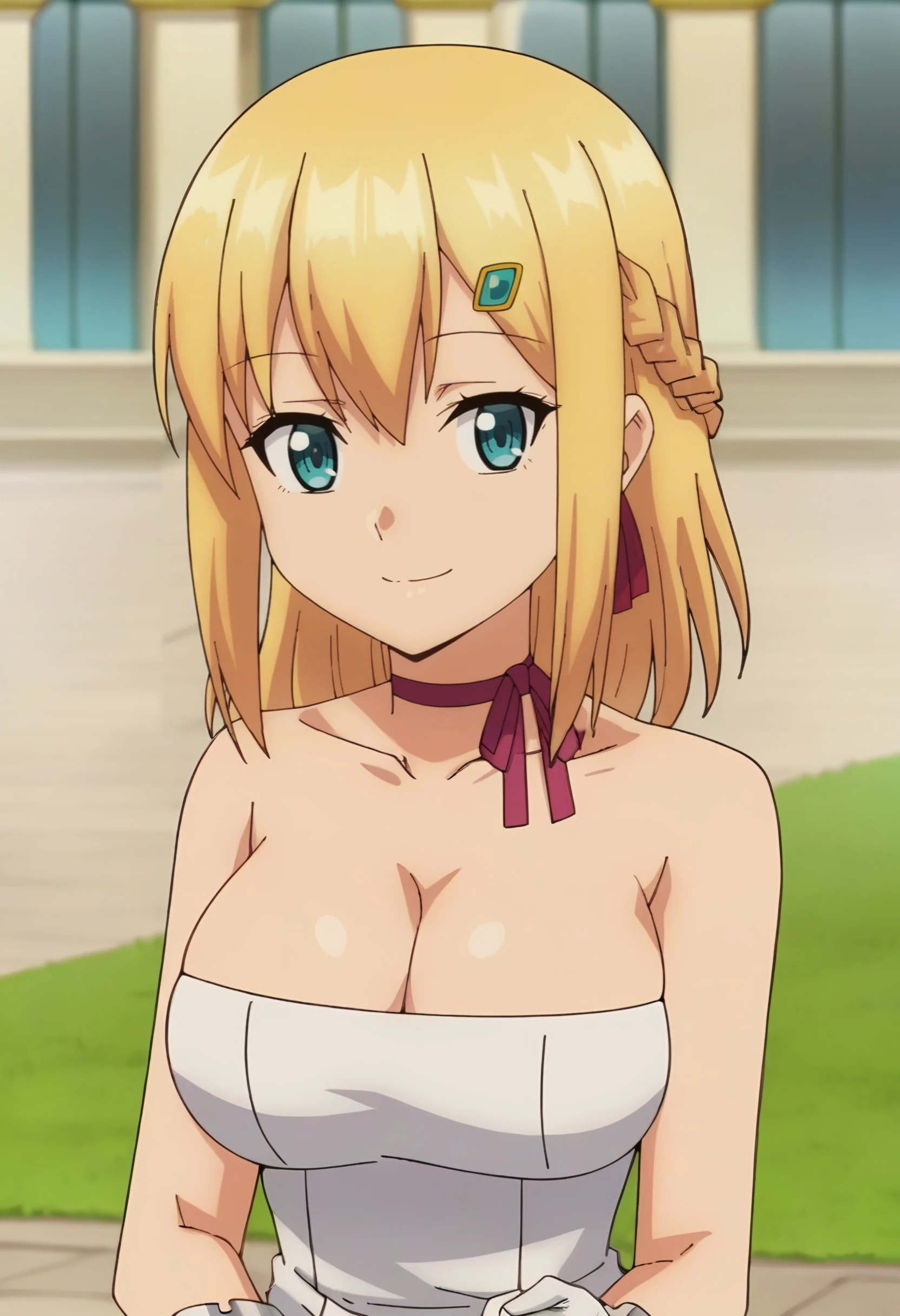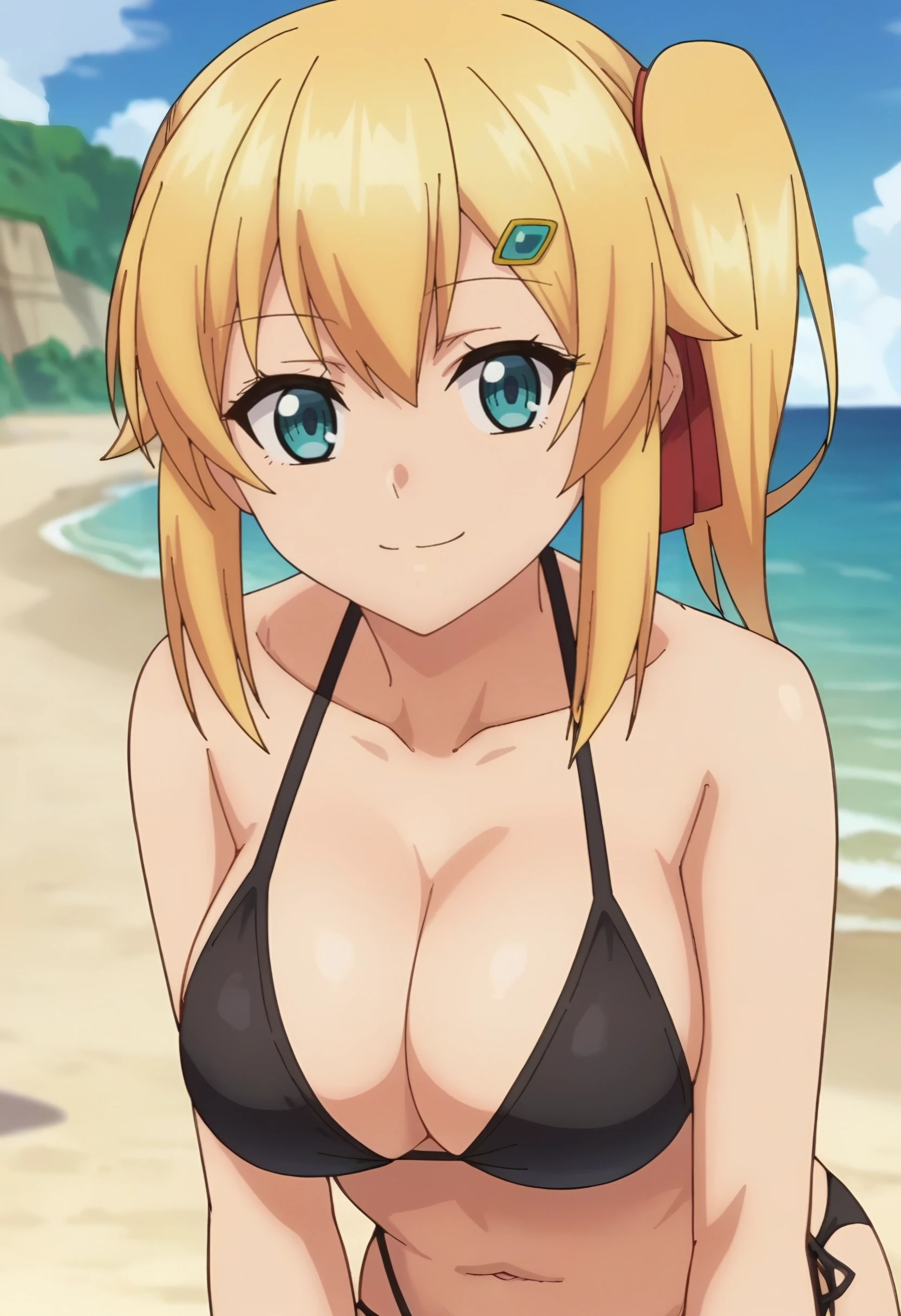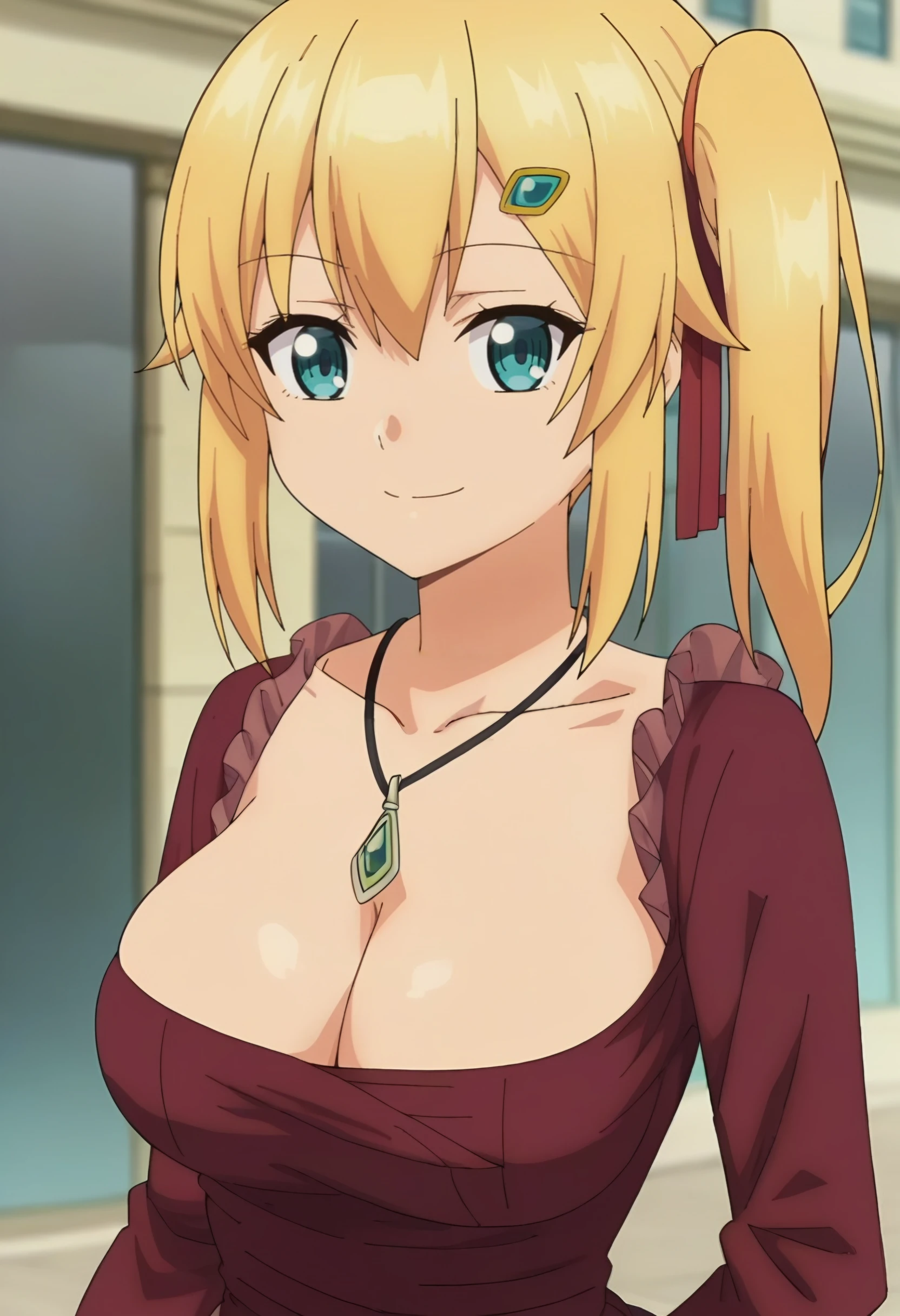 emma brightness, blonde_hair, 1girl, hair_ornament, blue_eyes, hairclip, solo, side_ponytail, large_breasts,