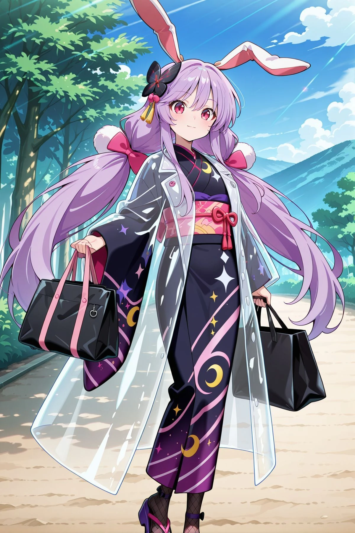 reisen udongein inaba, 1girl, solo, pink eyes, purple hair, very long hair, sidelocks, low twintails, rabbit ears,, reisen udongein inaba \(new year lunar war soldier\), alternate costume, leaf hair ornament, black leaf ornament, silver crescent hairpin, hair bow, pink bow, pom pom hair ornament, see-through coat, open coat, furisode, black kimono, space print kimono, long sleeves, wide sleeves, pink obi, blue obiage, black obijime, black socks, fishnet socks, purple sandals, flight pack, blunderbuss, holding grab bag, black bag,