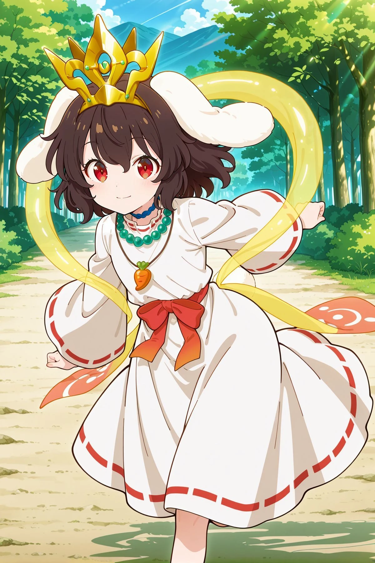 inaba tewi, 1girl, solo, red eyes, brown hair, rabbit ears, floppy ears, rabbit tail,, inaba tewi \(white earth rabbit\), alternate costume, hair ornament, gold kanmuri crown, gold hairband, hair bow, red bow, blue choker, bead choker, multiple necklaces, magatama necklace, bead necklace, white hagoromo, white kimono, long sleeves, wide sleeves, ribbon-trimmed sleeves, waist bow, pink bow, sash,