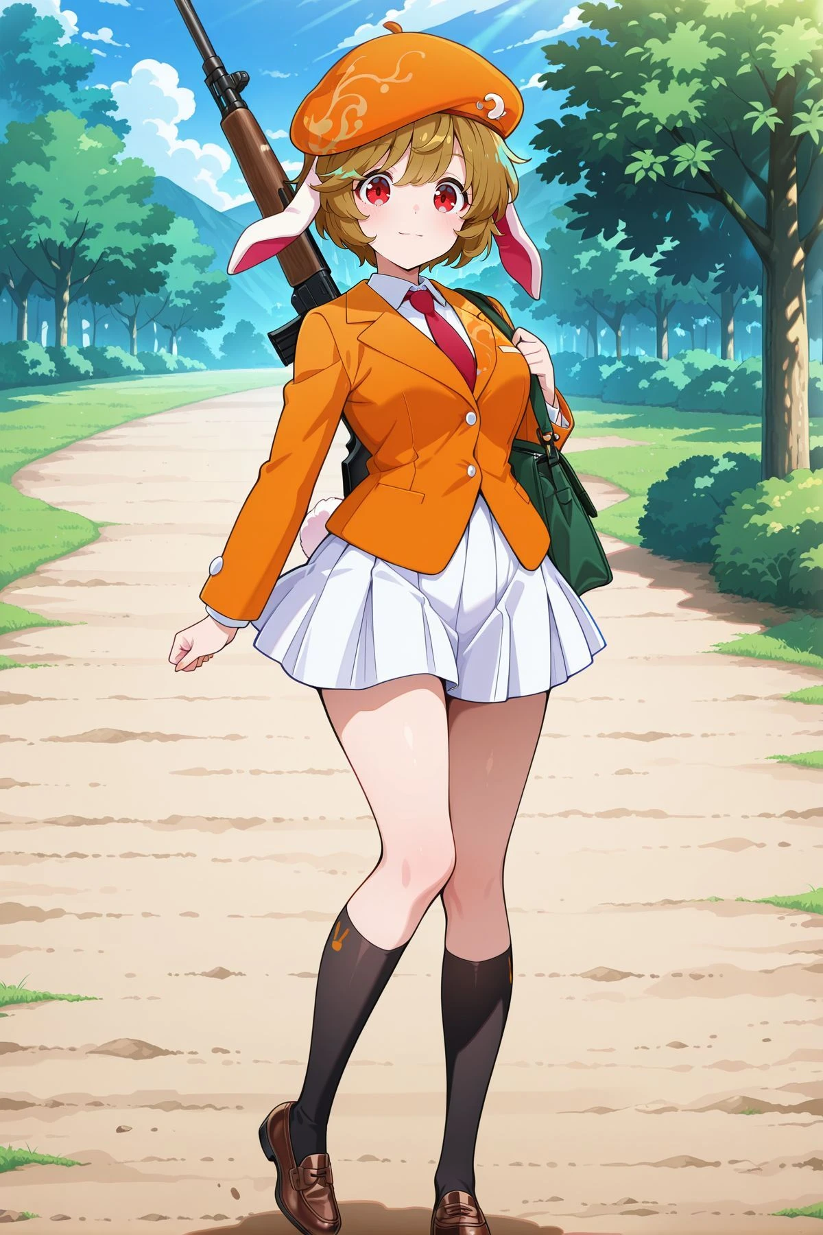 ringo, 1girl, solo, red eyes, brown hair, short hair, rabbit ears, floppy ears, rabbit tail, aged up,, ringo \(the orange eagle ravi\), alternate costume, orange beret, dango hat ornament, red necktie, orange jacket, long sleeves, white buttons, white shirt, collared shirt, pleated skirt, white skirt, black kneehighs, brown shoes, shoulder bag, green bag, weapon on back, assault rifle,