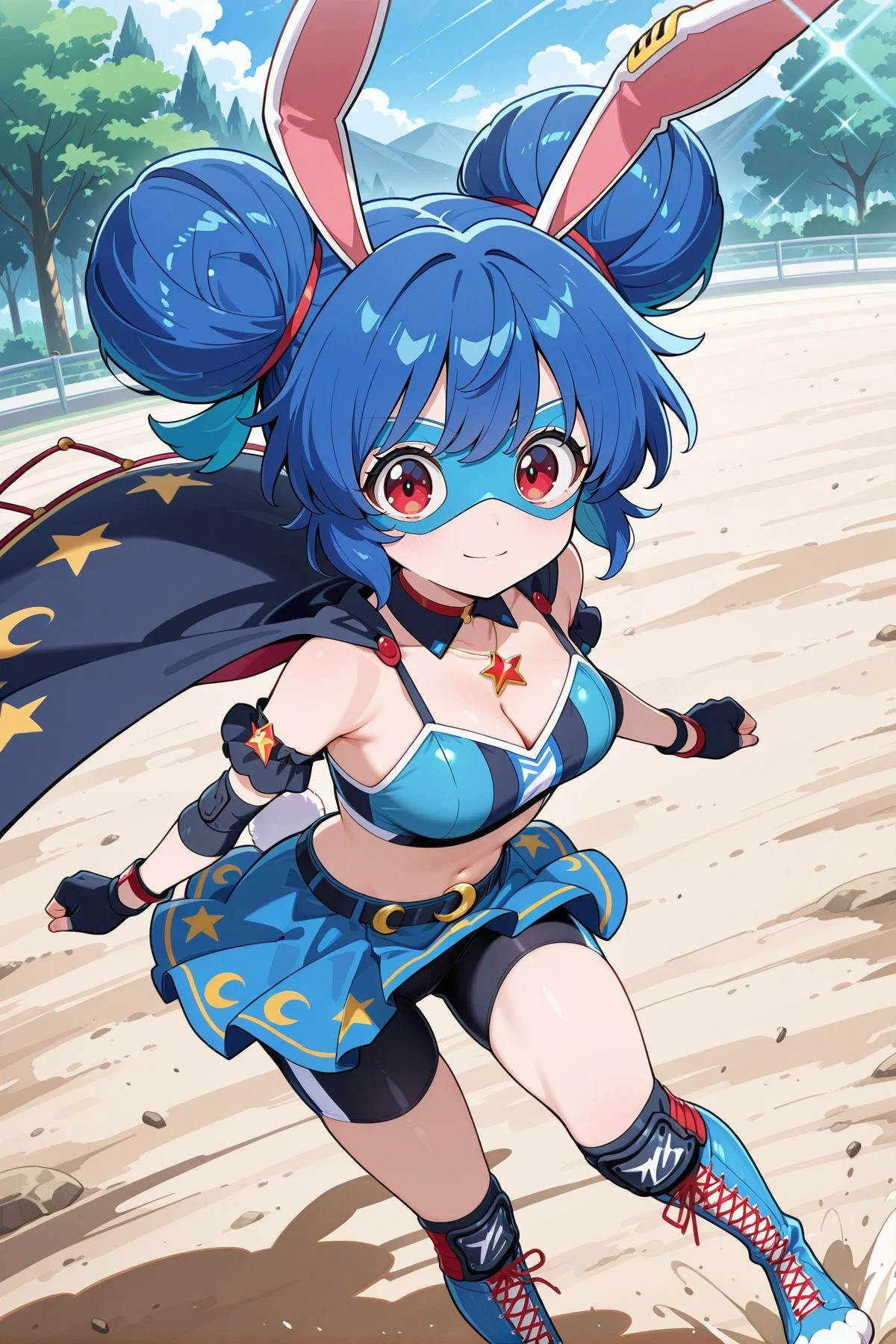 seiran, 1girl, solo, red eyes, blue hair, hair bun, double bun, rabbit ears, rabbit tail,, seiran \(codename chive\), alternate costume, yellow earclip, domino mask, blue mask, black cape, red star necklace, red choker, detached collar, black collar, bare shoulders, cleavage, wrestling outfit, crop top, black shirt, black armband, frilled armband, elbow sleeve, fingerless gloves, black gloves, midriff, black belt, crescent belt buckle, blue skirt, bike shorts under skirt, black shorts, black knee pads, kneehighs, cross-laced footwear, blue boots, paw shoes,
