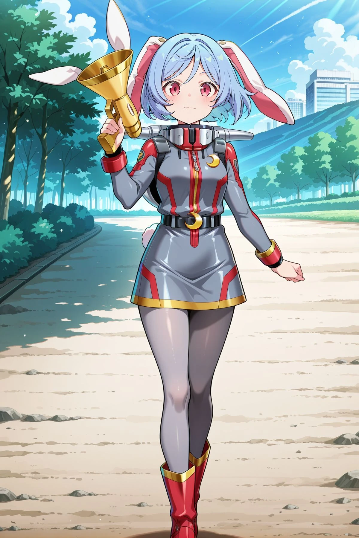 rei'sen, 1girl, solo, pink eyes, light blue hair, short hair, rabbit ears, floppy ears, rabbit tail,, reisen \(peacekeeper of the capital\), alternate costume, spacesuit, grey suit, long sleeves, gold trim, crescent belt buckle, black belt, grey skirt, pencil skirt, grey pantyhose, multicolored boots, grey boots, red boots, holding lunatic gun, grey space helmet, unworn helmet, helmet on back,