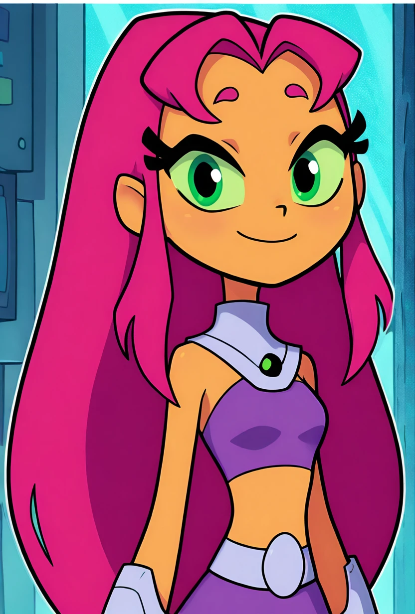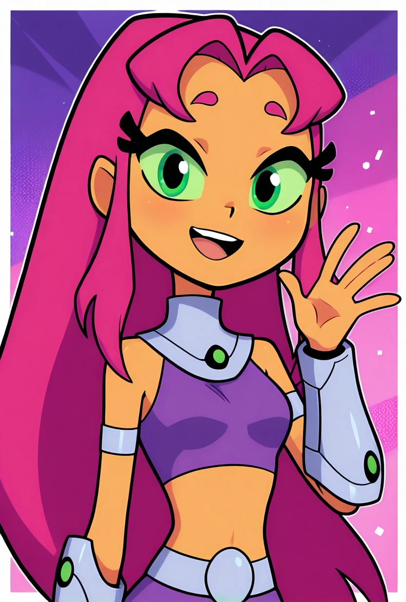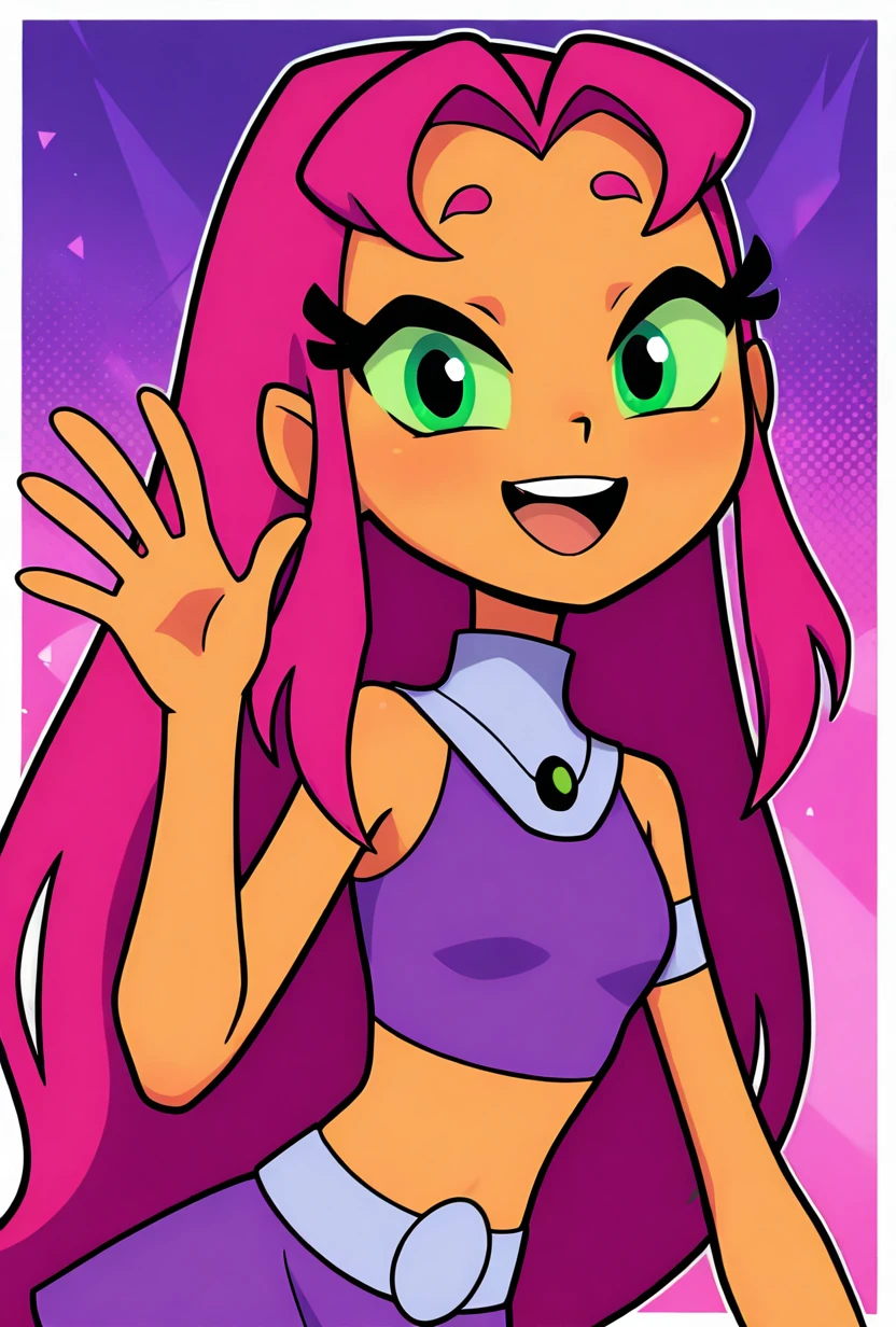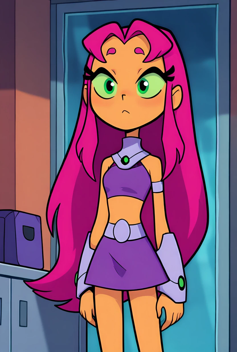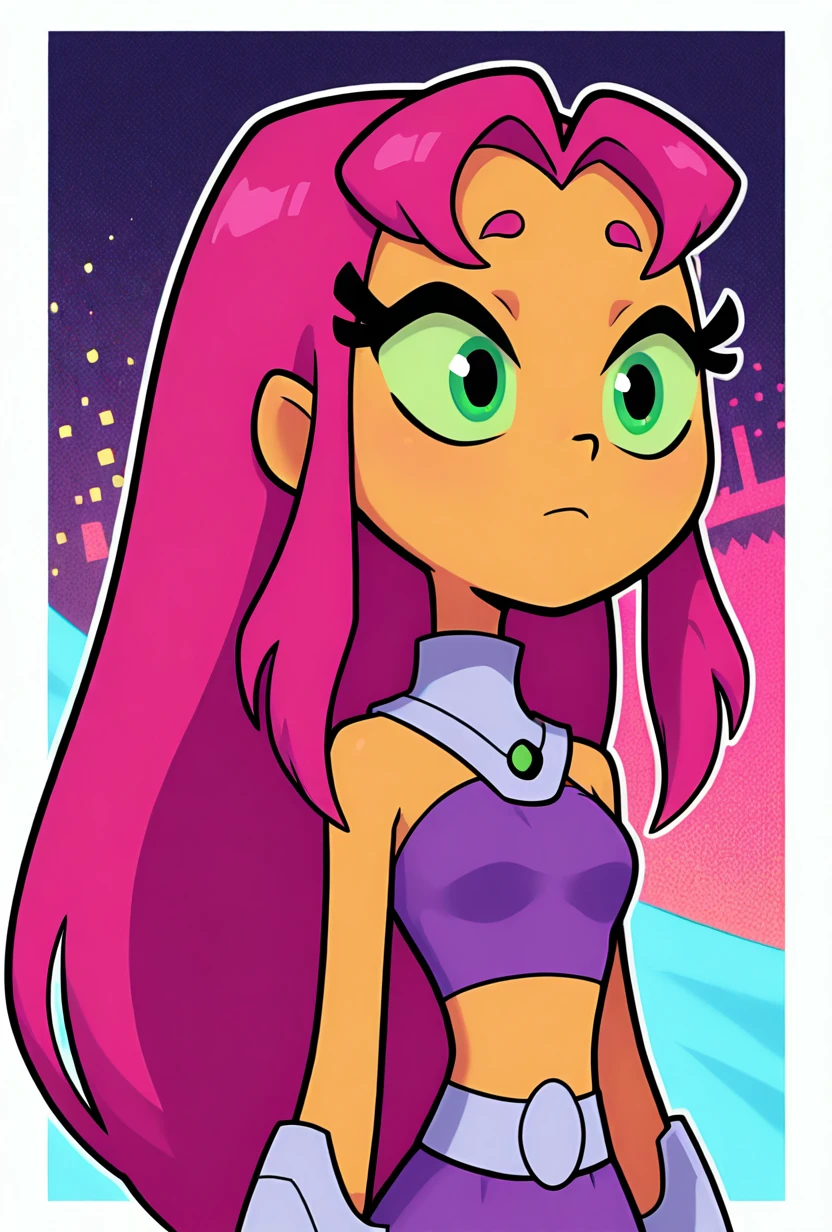 starfirettgo, 1girl, solo, long hair, purple miniskirt, green eyes, pink hair, sidelocks, midriff, purple crop top, sleeveless, orange skin, colored sclera, cartoon,