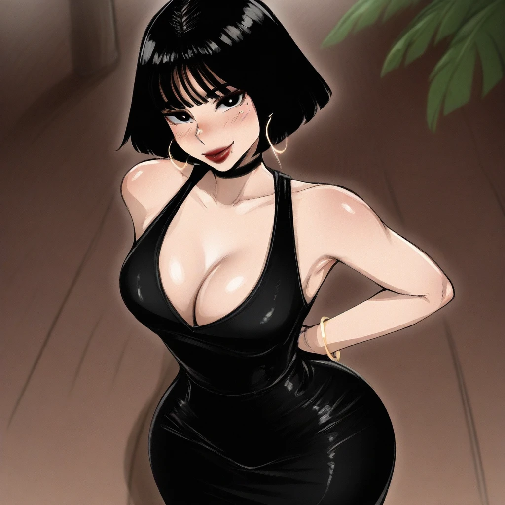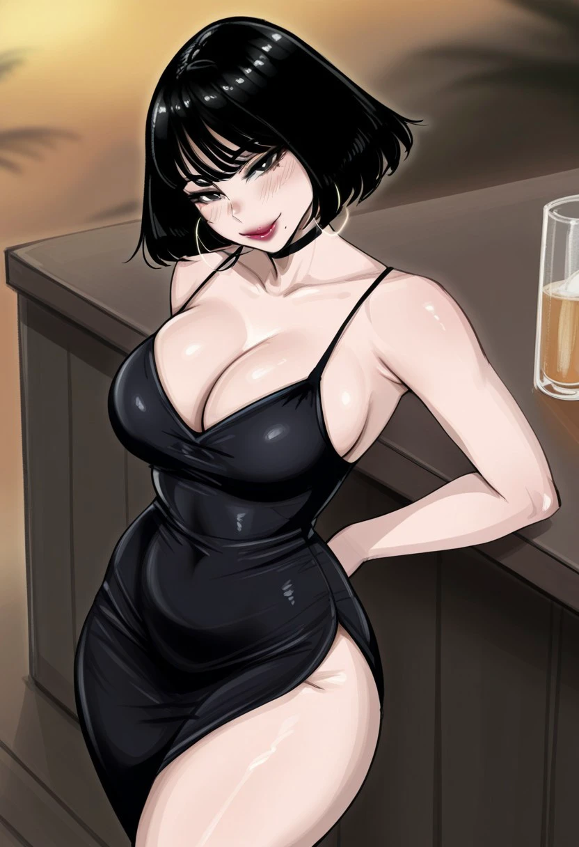 4. ((sexy sleeveless black dress, obscene cleavage, huge cleavage, black choker collar, gold hoop earrings, ))