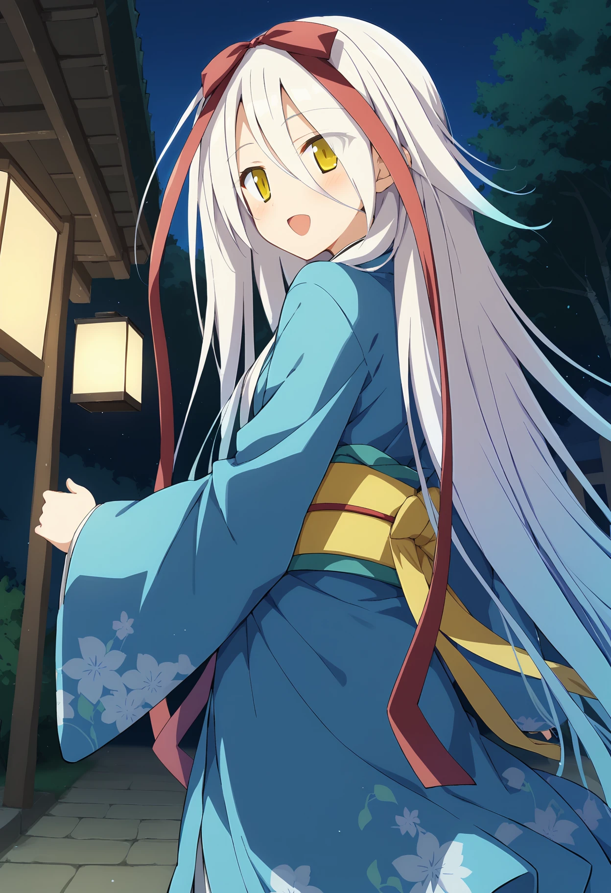 white hair, long hair, very long hair, gradient hair, multicolored hair, hair between eyes, yellow eyes, hair ribbon, red ribbon,